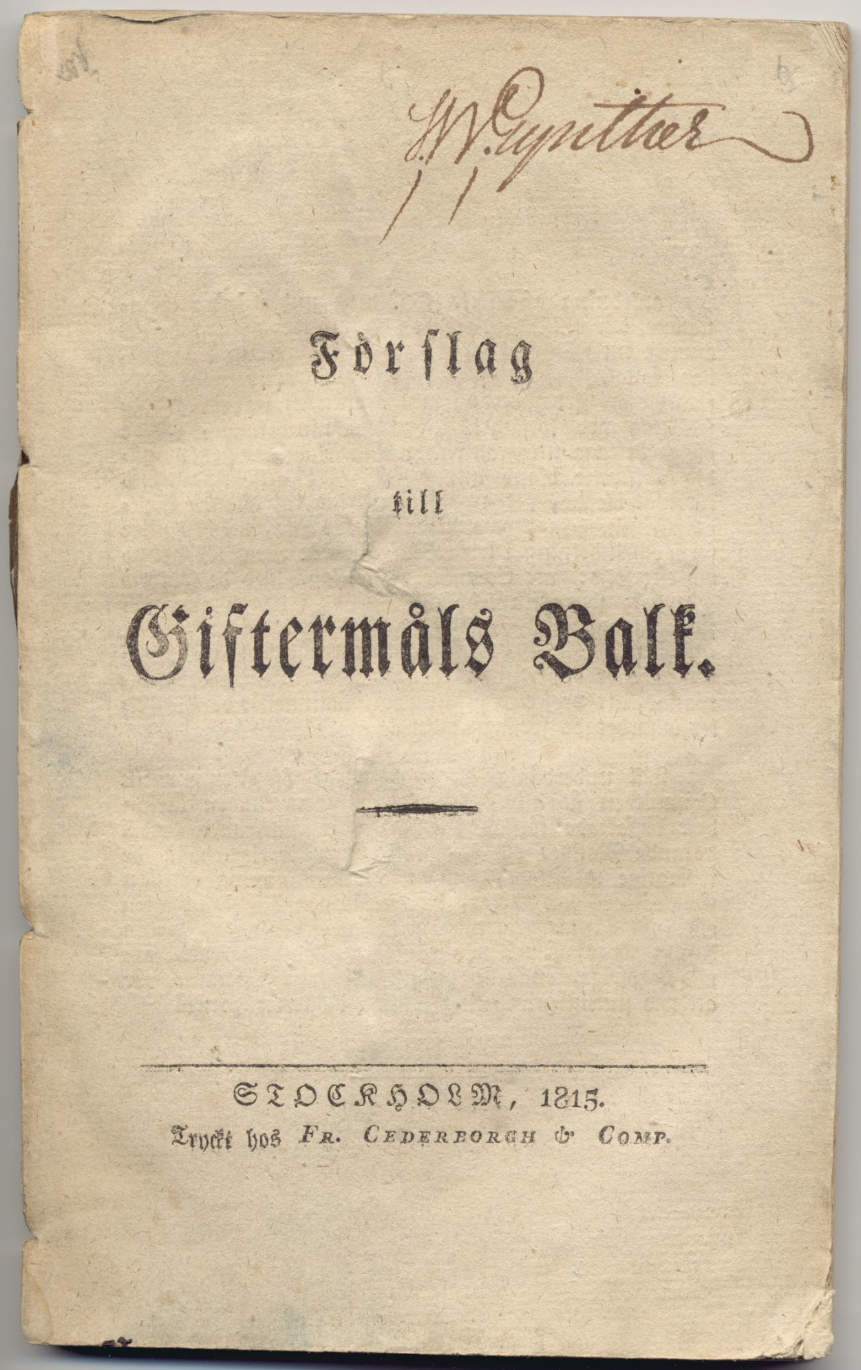 Sthlm, F. Cederborgh & comp., 1815. 8:o. (4),38 s. + Motiver till giftermåls balken. [=rubrik]. U.o., u.å. 8:o. 67 s. Tagen ur band. Lätt bruntonade ark omväxlar med vitare ark. Namnteckning S. W. Gynther på titelbladet.