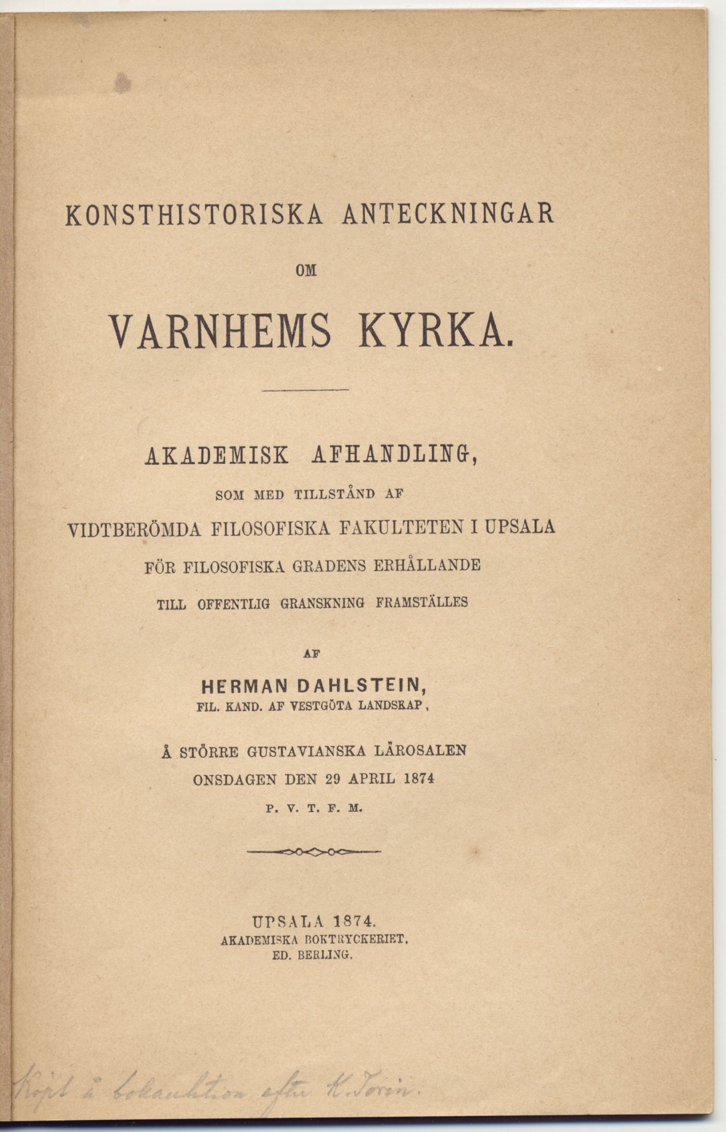 Uppsala, E. Berling, 1874. 8:o. (4),35 s. Häftad i blankt brunt omslag och insatt i senare ljusbrunt pappomslag. Någon liten diskret rättelse. Dedikation till K. J. Torin på främre omslaget och anteckning ”Köpt å bokauktion efter K. Torin” samt namnteckning Sandberg 1908.