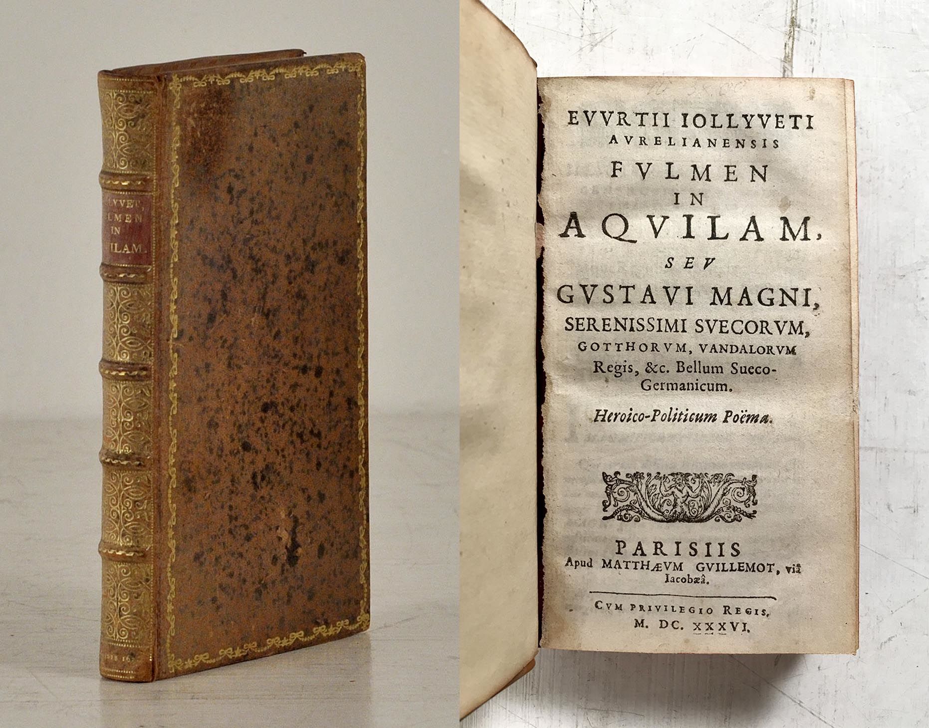Warmholtz Bibliotheca historica Sueo-Gothica 3800. Med tryckt dedikation till Axel Oxenstierna och hyllningsverser av bland annat Jonas Hambraeus. Den franska hugenotten Euverte Jollivets (1604-62) hyllning på vers till Gustav II Adolf. Jollivet författade även en ”Histoire générale des suedois et des goths” som i manuskriptform förvaras i Kungliga biblioteket och han lär ha ägt värjan som konungen burit i slaget vid Lützen. Hambraeus var präst och professor i orientaliska språk i Paris dit han anlände 1626 som ambassadpredikant. Av bandet att döma är nog boken ur Gustaf Holdo Stråles bibliotek.