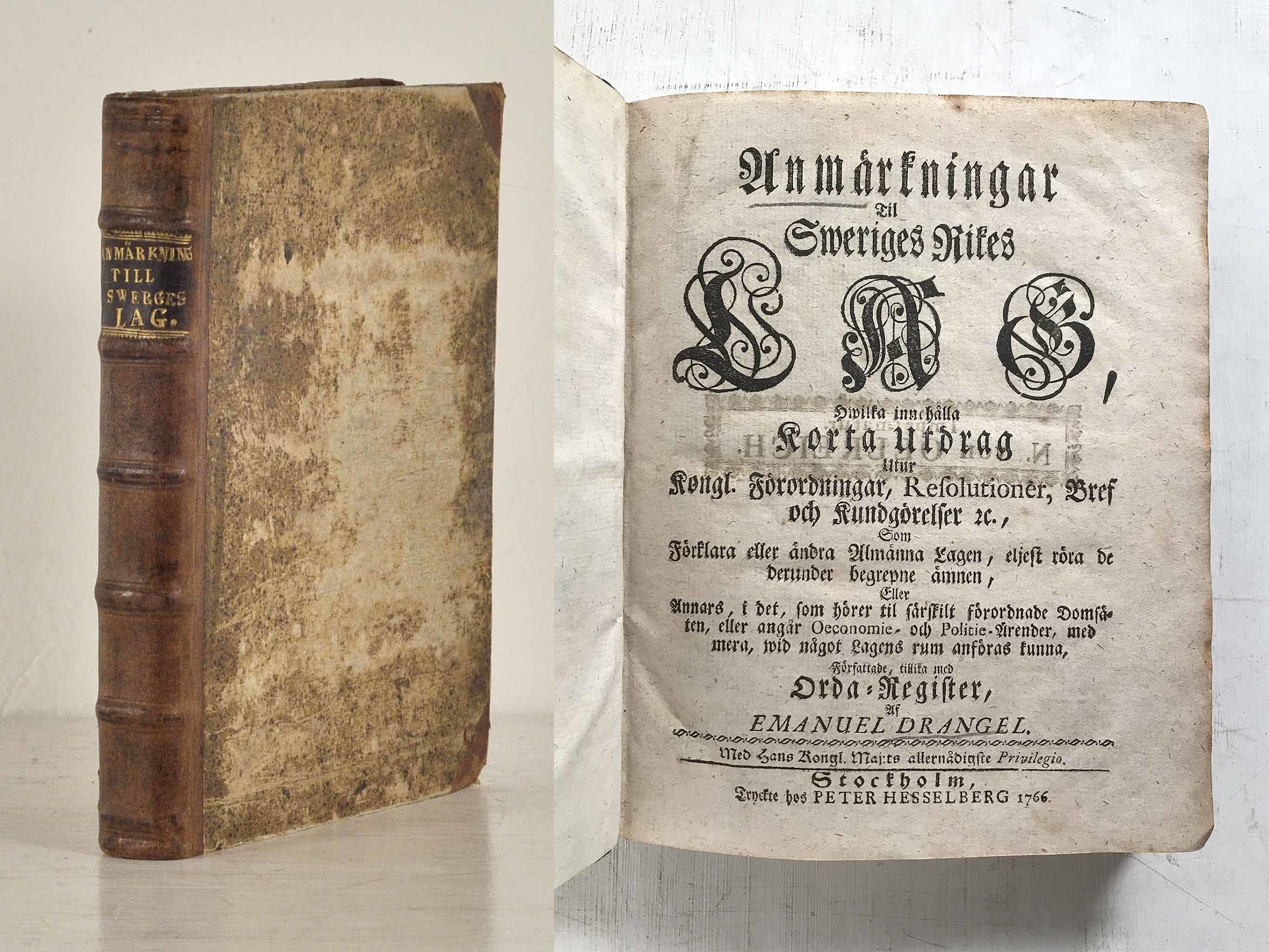 Sthlm, P. Hesselberg, 1766. 4:o. (8),492,(52) s. Samtida hfrbd med upphöjda bind, blindlinjerad rygg och titeltryck i guld på mörkbrunt fält. Stänkta snitt. Pärmpappret till stora delar hårt skavt. En bit av övre delen av försättsbladet bortklippt. Inlagan med enstaka lager- och småfläckar. En fuktfläck i yttre marginalen på s. 245 och en tråkig fläck i nedre marginalen på den sista registersidan. Med gamla insatta marginalanteckningar samt under- och överstrykningar. Svagt spår av borttaget exlibris på frampärmens insida.