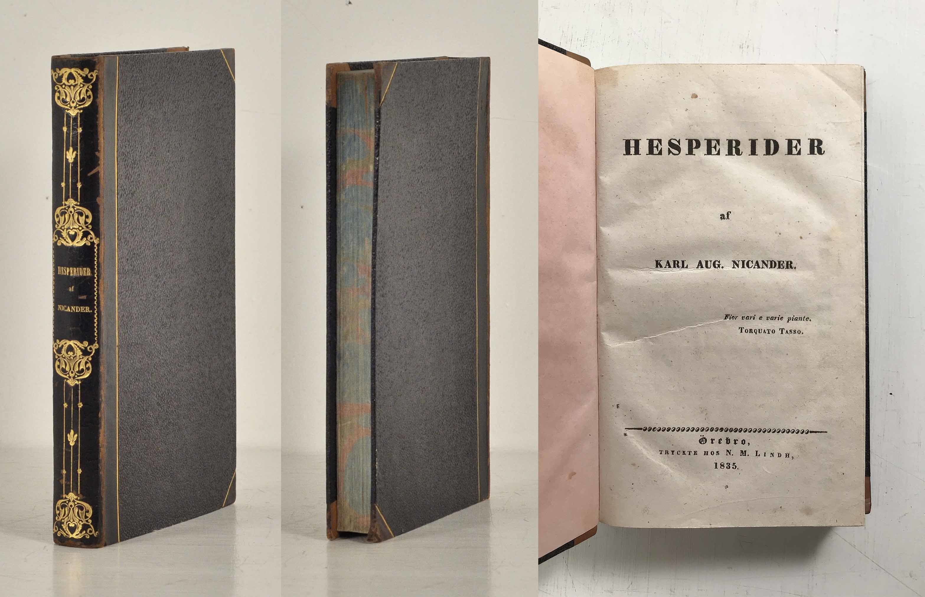 Örebro, N. M. Lindh, 1835. 8:o. (4),329 s. Samtida svart hfrbd med rikt gulddekorerad rygg och marmorerade snitt. Något nötta falsar. Spridda fläckar, t.ex. ett par fuktfläckar på s. 4-7, fläckar i övre marginalen på s. 82-88 och en fuktrand i övre marginalen på s. 259-70. Lorentz Eric Lindblads namnteckning daterad Uppsala 1847 och Gösta Hjortzbergs exlibris. På bakpärmens insida en liten numrerad biblioteksetikett.
