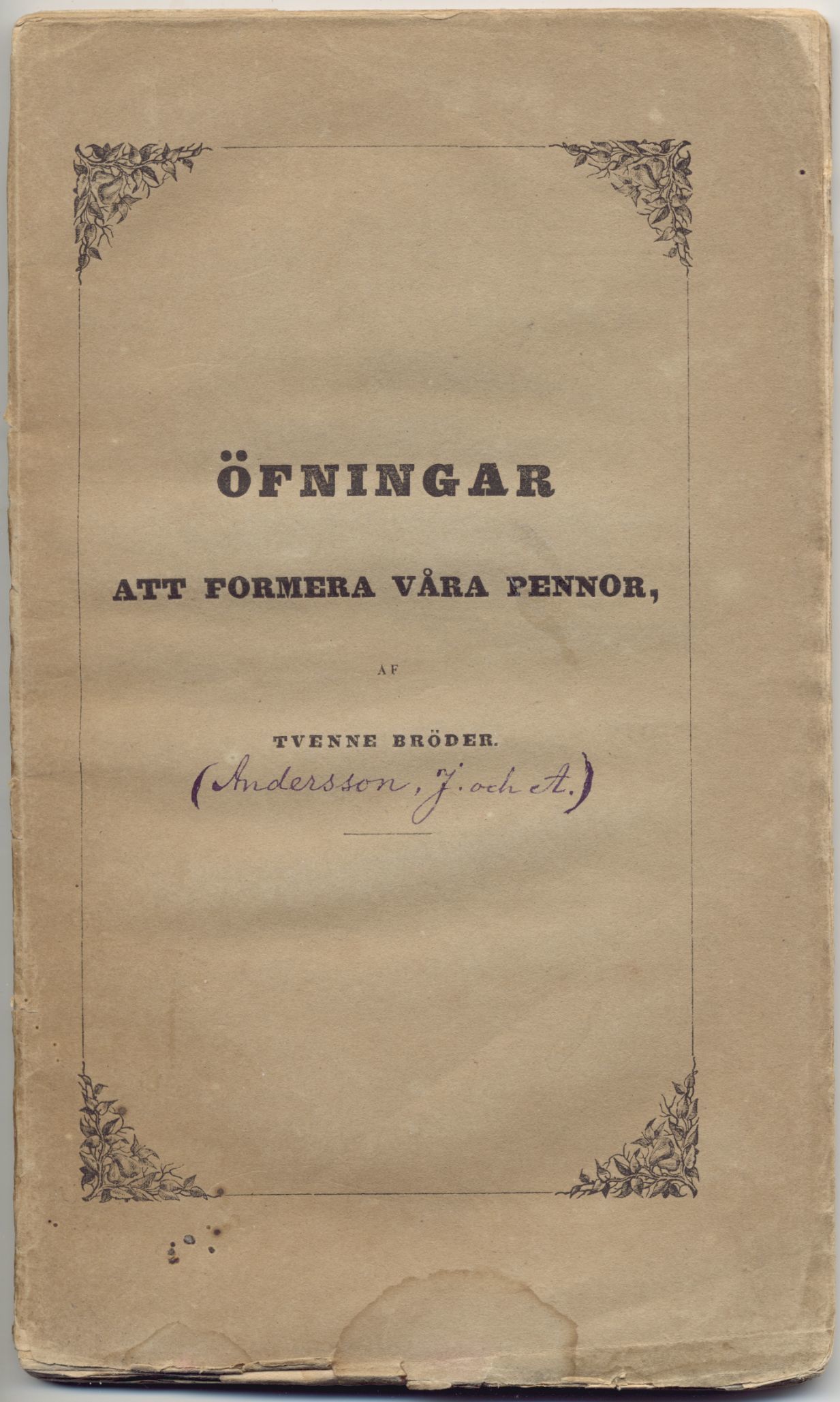 Jönköping, J. P. Lundström, 1843. 8:o. (2),VI,94,(2) s. Häftad och oskuren med det främre bruna tryckta omslaget, det bakre saknas. Tillskrivna författare på omslaget. En fuktrand i nedre marginalen på omslaget och de första tjugo sidorna återkommer sporadiskt i försvagat skick. Sista sidan delvis loss.