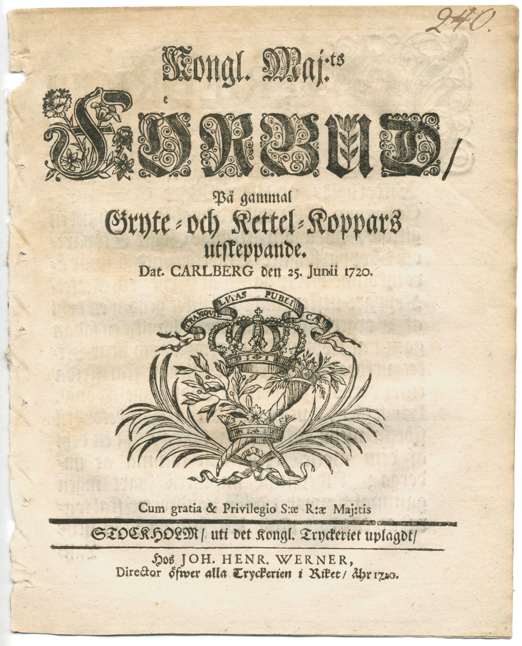Kongl. maj:ts förbud/ på gammal gryte- och kettel-koppars utskeppande. Dat. Carlberg den 25 junii 1720.