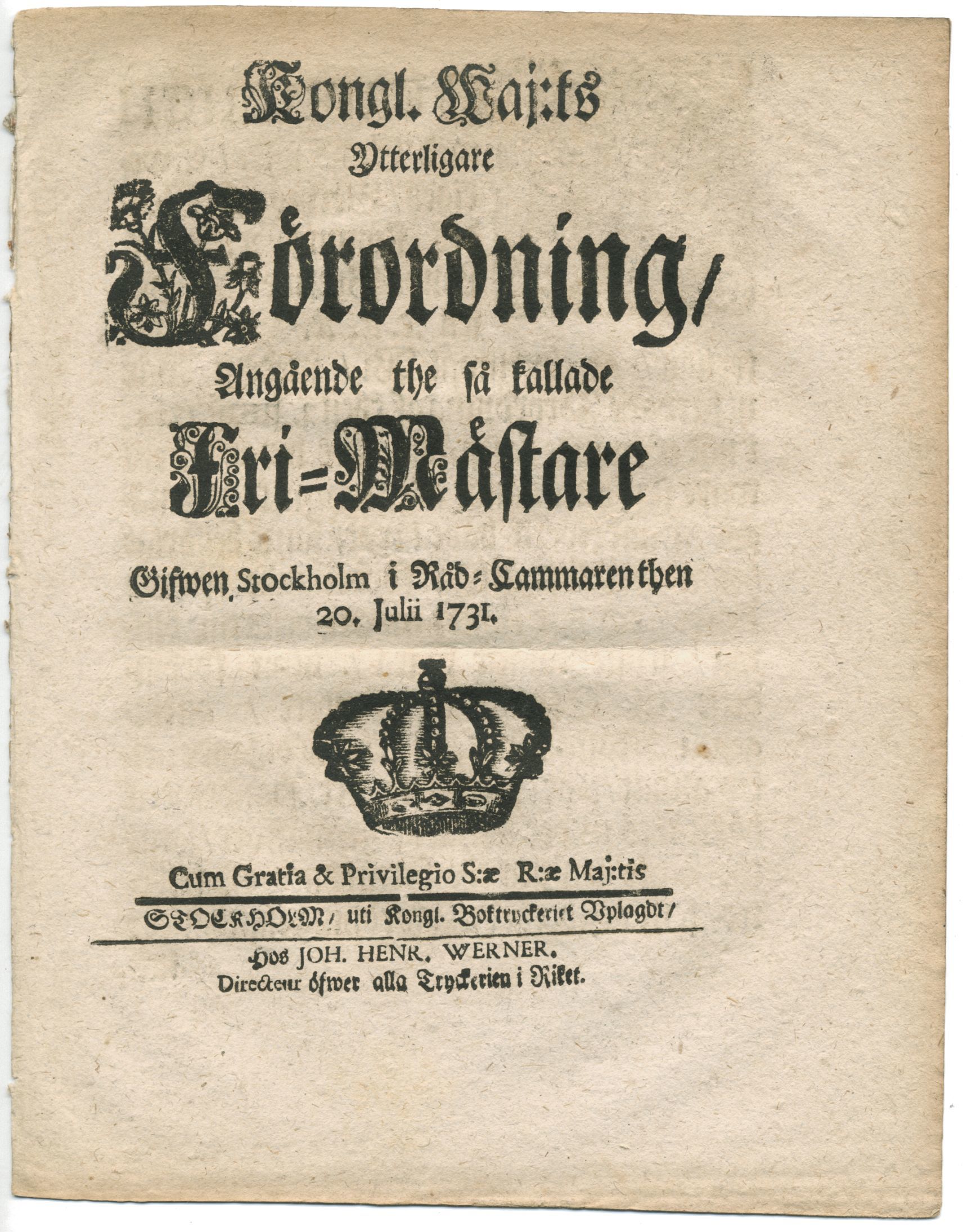 Kongl. maj:ts ytterligare förordning, angående the så kallade fri-mästare. Gifwen Stockholm i råd-cammaren then 20 julii 1731.