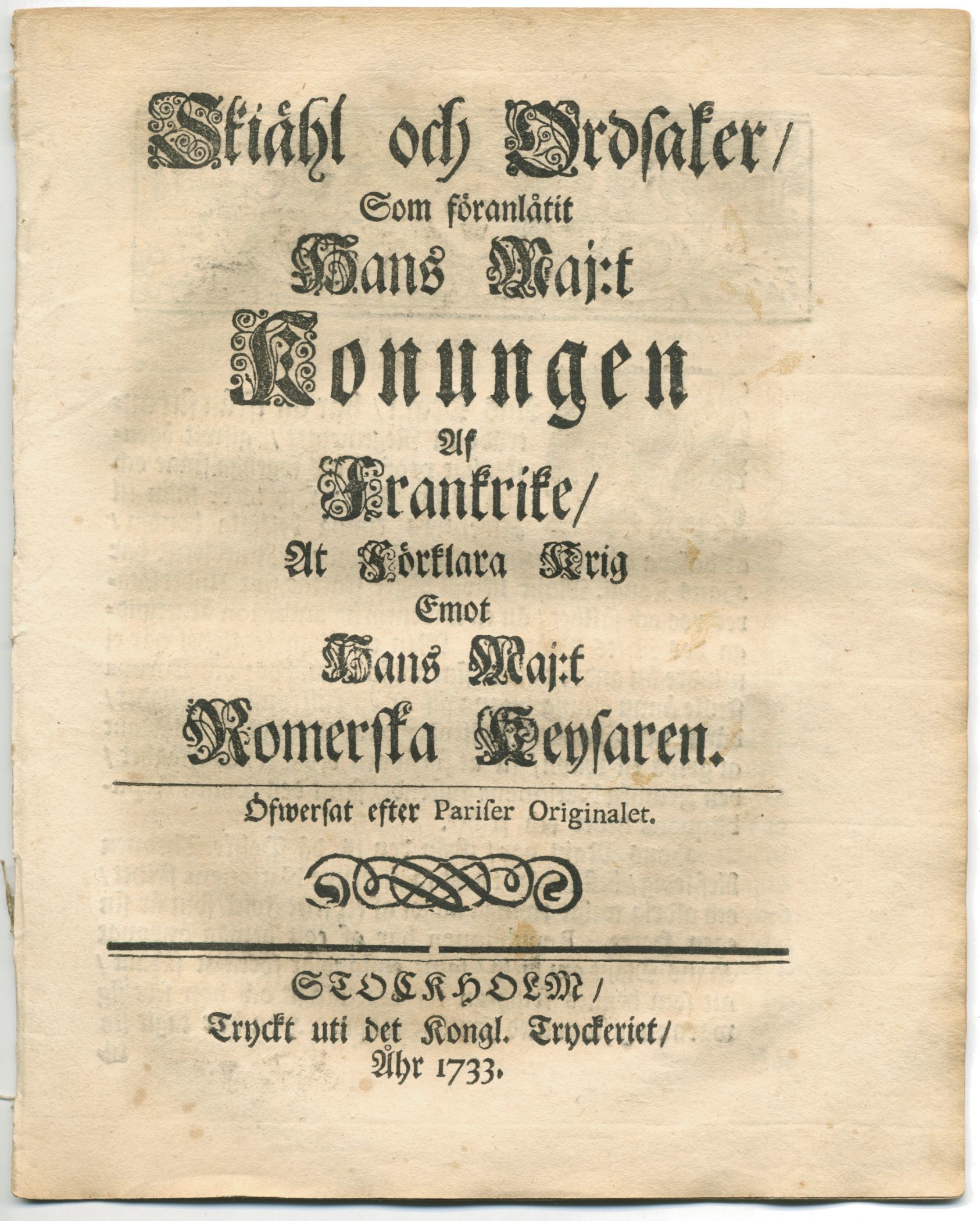 Skiähl och ordsaker/ som föranlåtit hans maj:t konungen af Frankrike/ at förklara krig emot hans maj:t romerska keysaren. Öfwersat efter Pariser originalet.