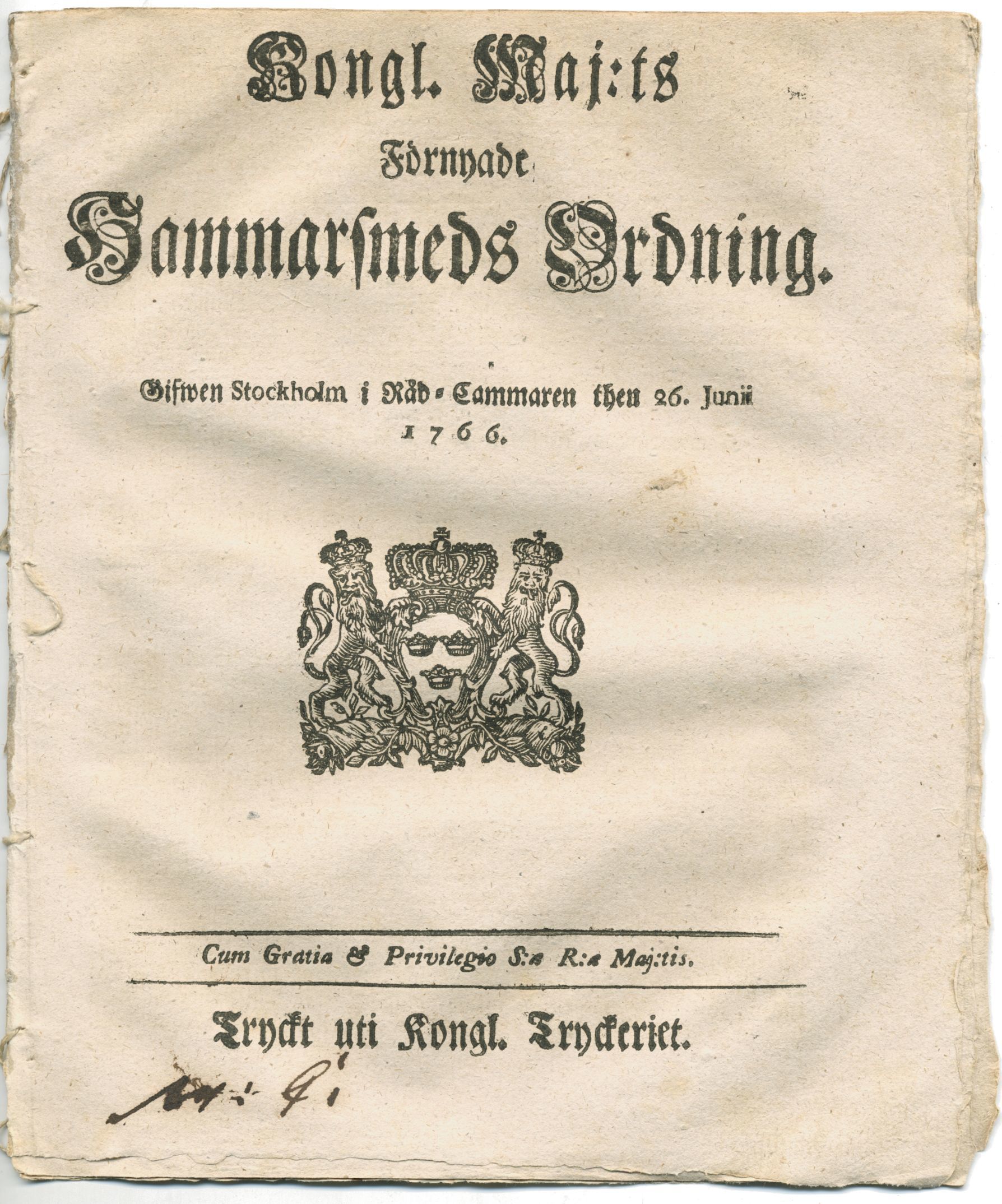 Kongl. maj:ts förnyade hammarsmeds ordning. Gifwen Stockholm i råd-cammaren then 26 junii 1766.
