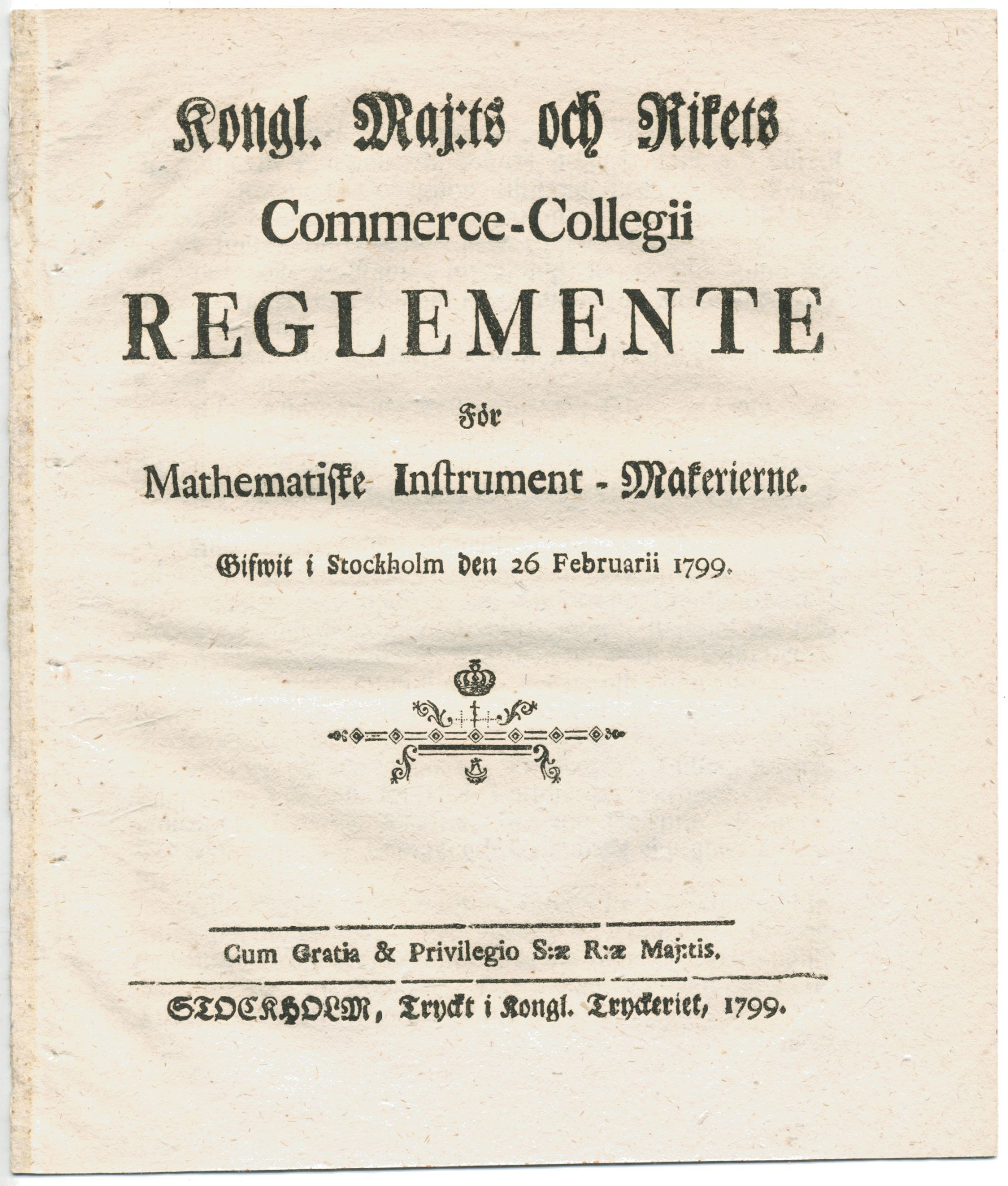 Kongl. maj:ts och rikets Commerce-collegii reglemente för mathematiske instrument-makerierne. Gifwit i Stockholm den 26 februarii 1799.