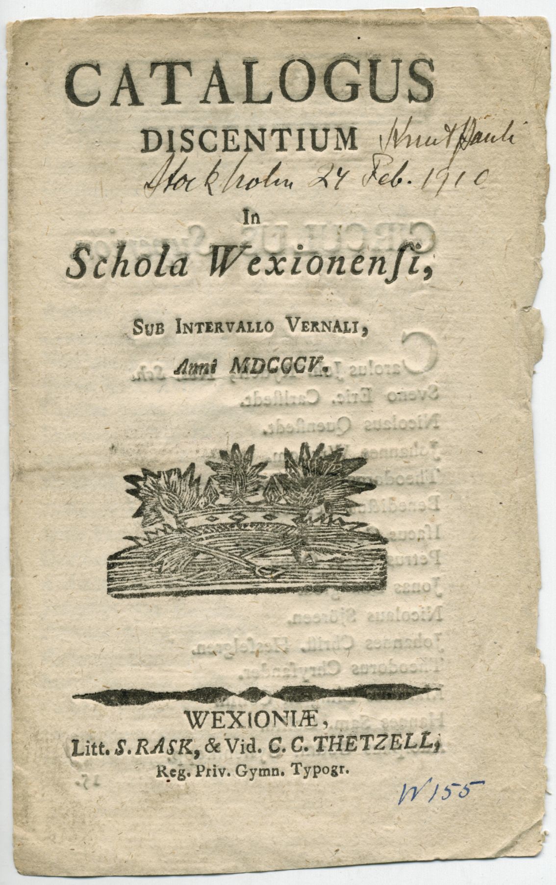 Catalogus discentium in schola Wexionensi, sub intervallo vernali anni MDCCCV.