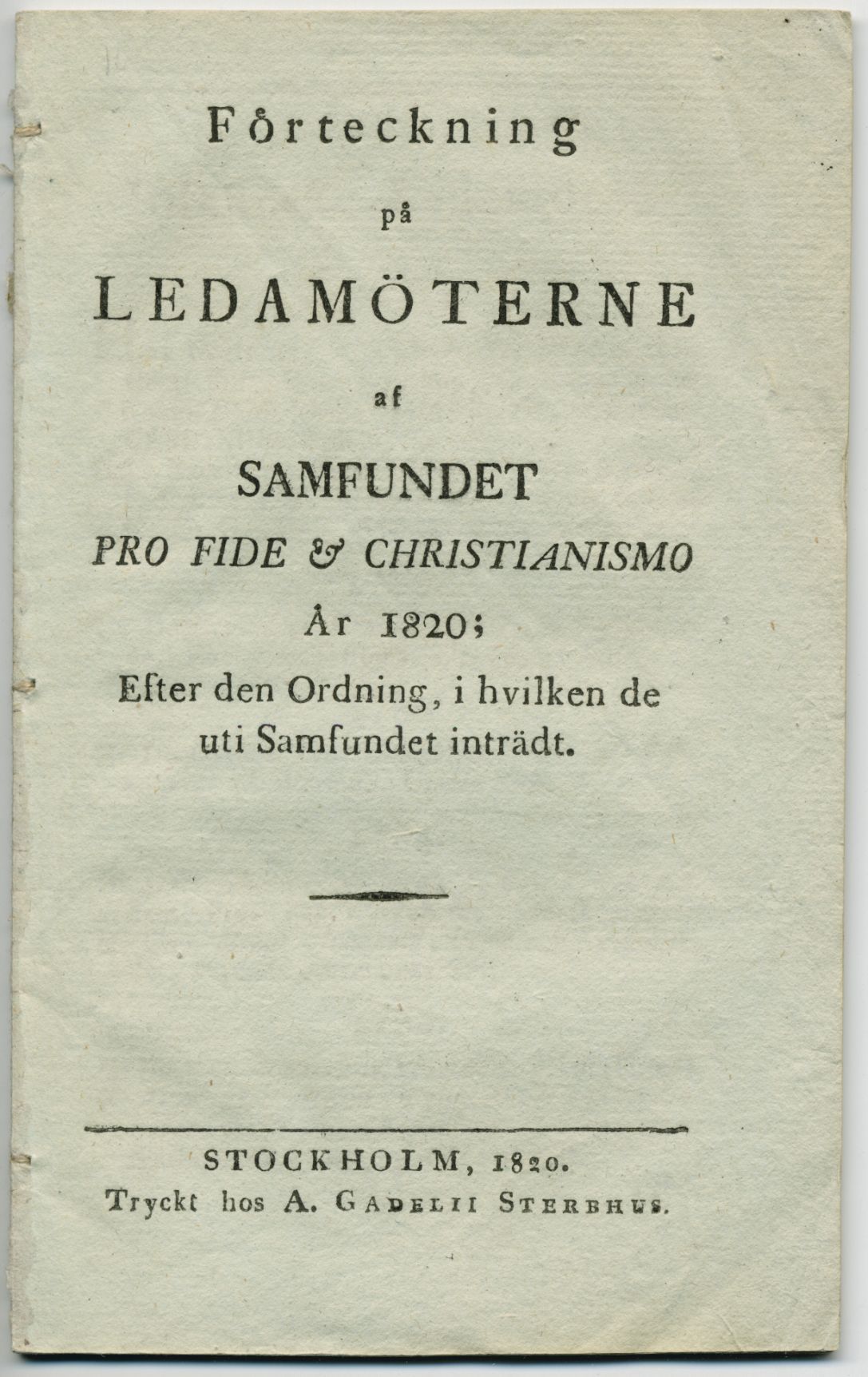 Förteckning på ledamöterne af Samfundet Pro fide & christanismo år 1820; efter den ordning, i hvilken de uti samfundet inträdt.