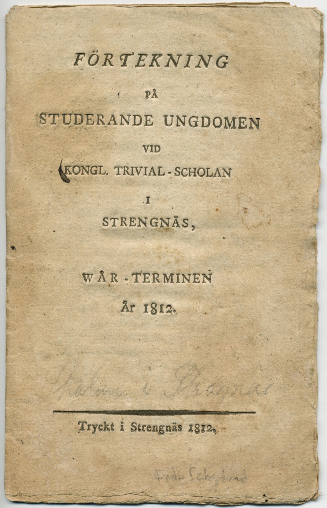 Förtekning på studerande ungdomen vid kongl. trivial-scholan i Strengnäs, wår-terminen år 1812.