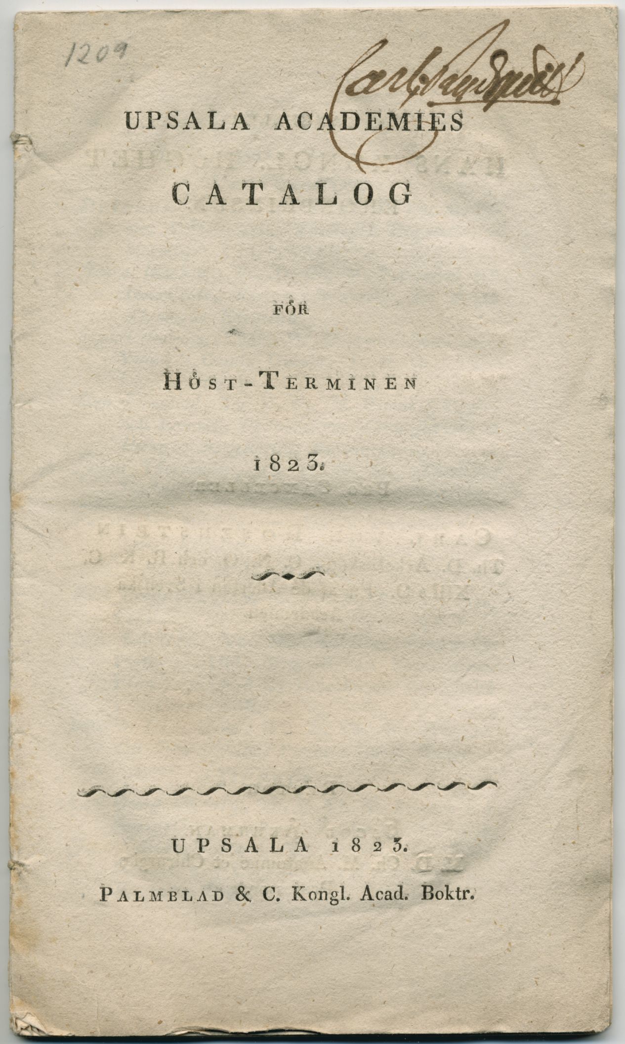 Uppsala, Palmblad & c., 1823. 8:o. (50) s. Häftad. Några sidor delvis lite lösa i häftningen. Ett flertal förbockningar och en del små bläckfläckar. Med Carl Rydqvists namnteckning.