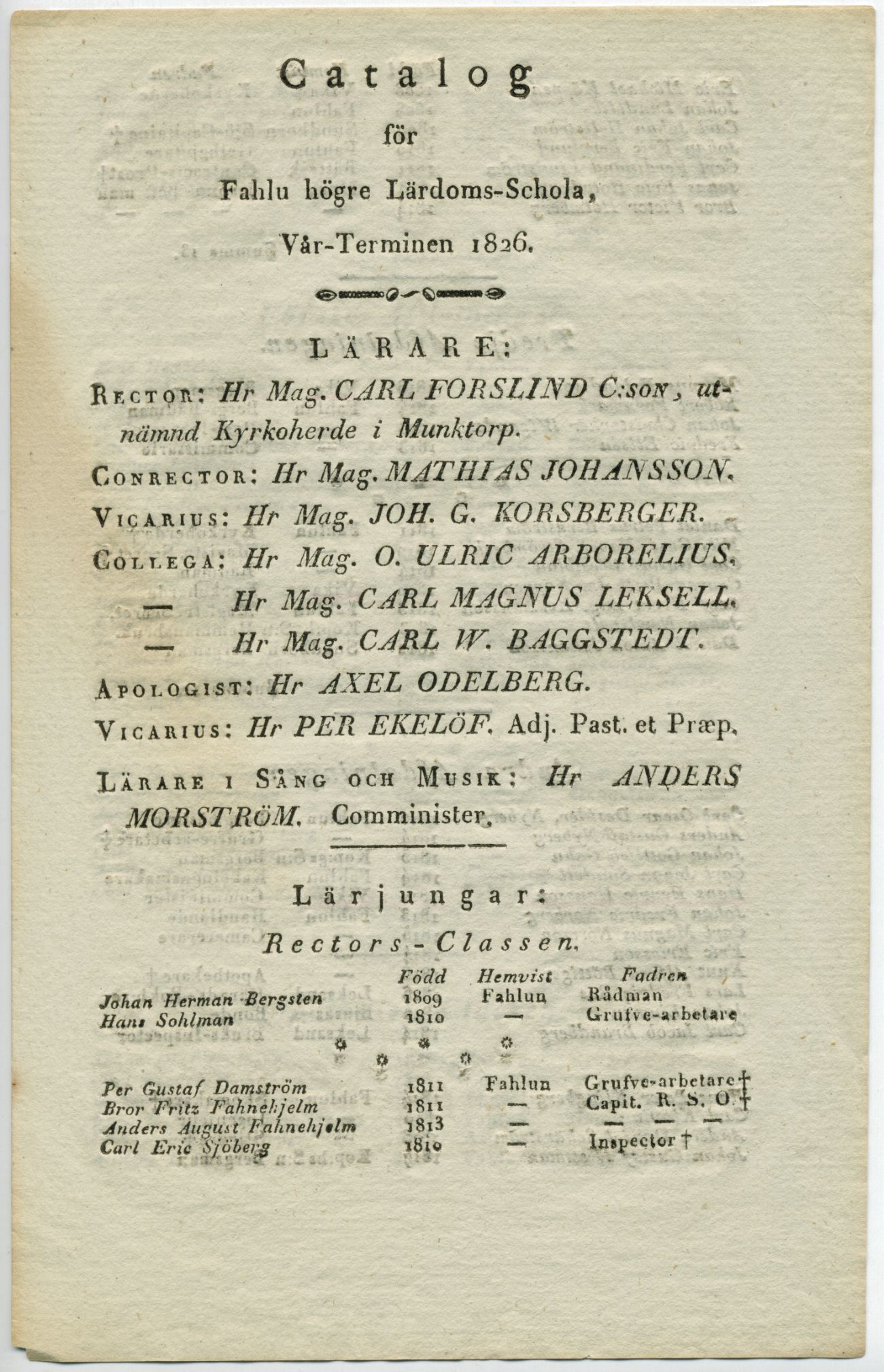 Catalog för Fahlu högre lärdoms-schola, vår-terminen 1826. [=rubrik].