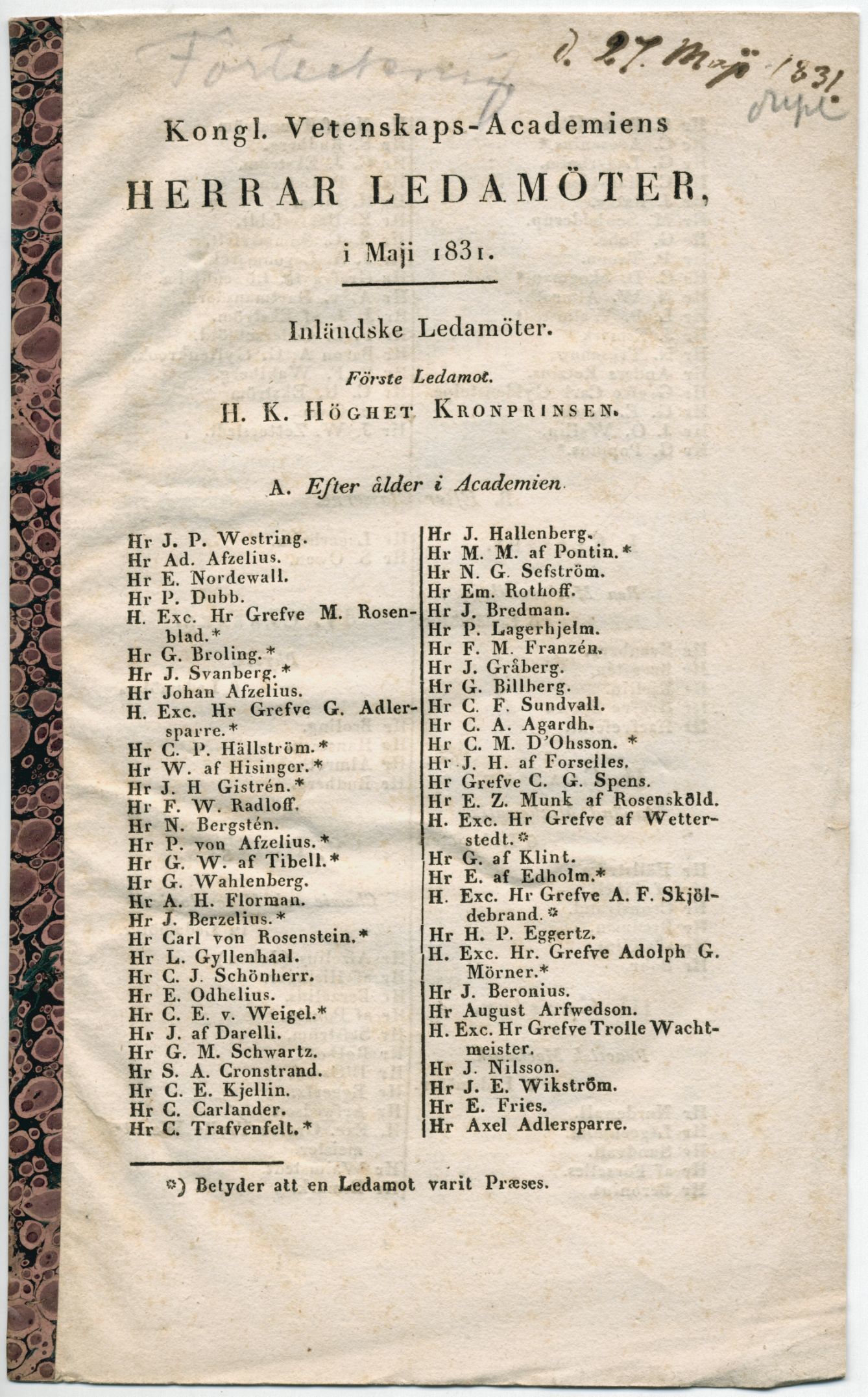 Kongl. Vetenskaps-academiens herrar ledamöter, i maji 1831. [=rubrik].