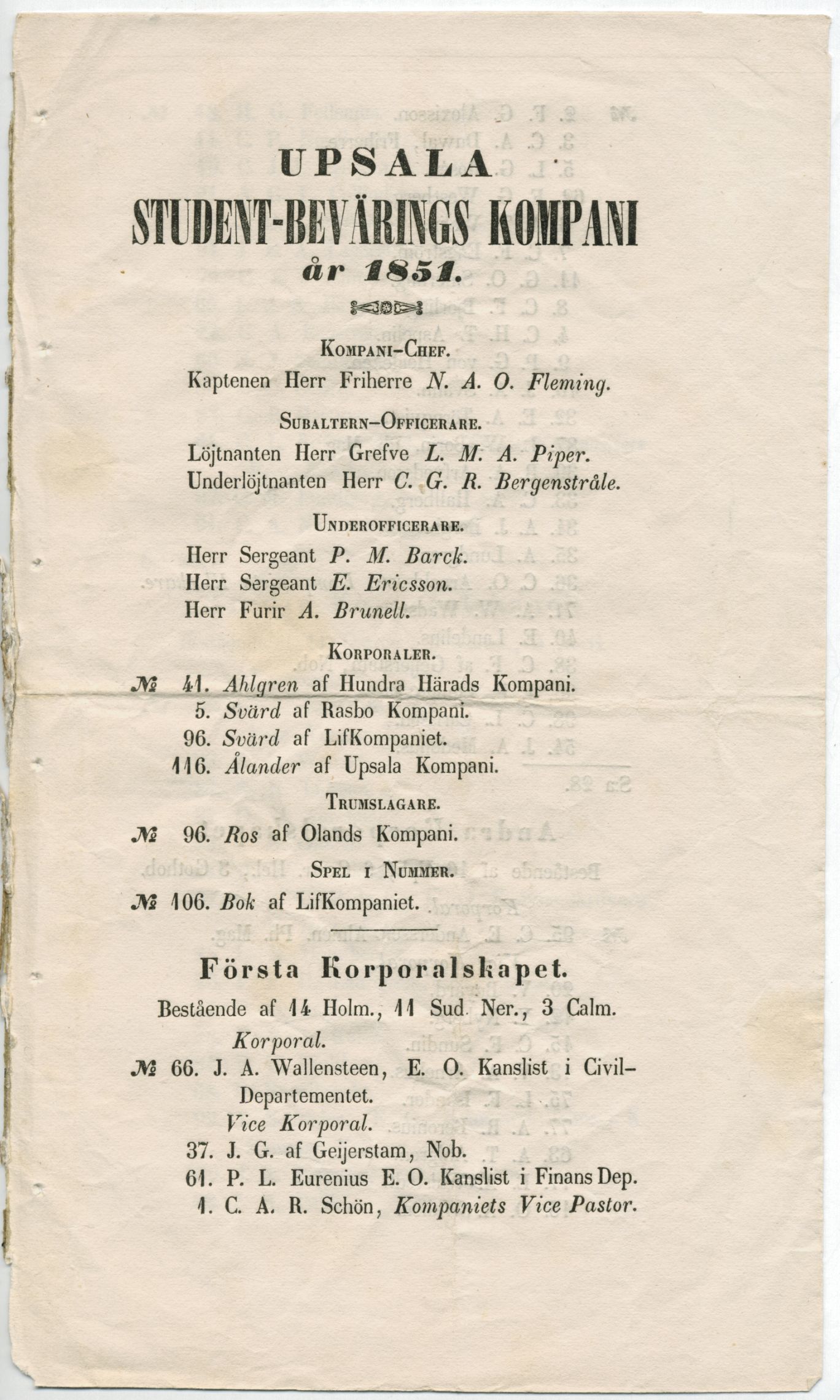 Upsala student-bevärings kompani år 1851. [=rubrik].
