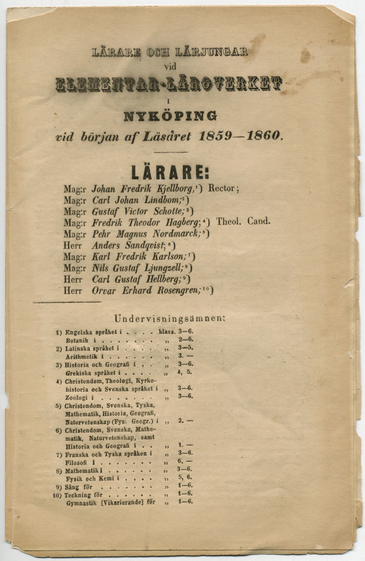 Lärare och lärjungar vid Elementar-läroverket i Nyköping vid början af läsåret 1859-1860. [=rubrik].
