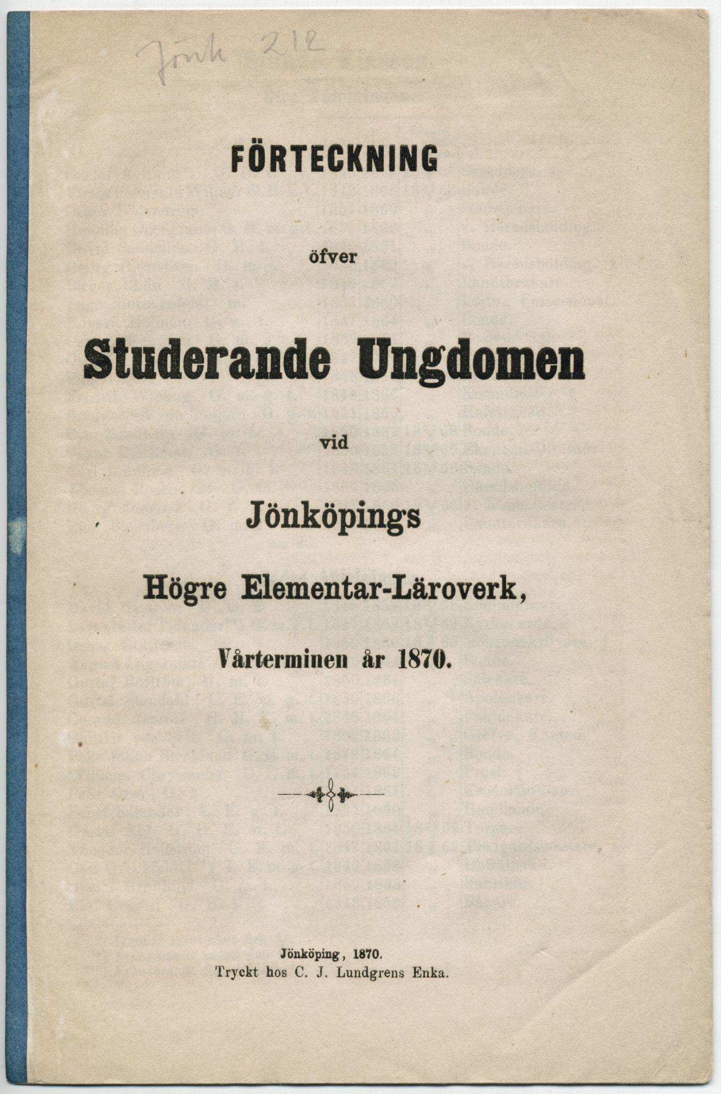 Förteckning öfver studerande ungdomen vid Jönköpings högre elementar-läroverk, vårterminen år 1870.
