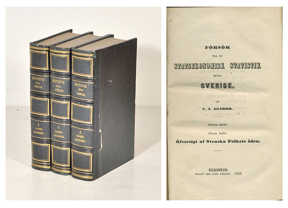 Första häftet är i första upplagan med kortare titel. Agardh avled 1859 och en fortsättning av det tredje delens tredje häfte av C. E. Ljungberg utkom 1863, men saknas här. ”Svenskt biografiskt lexikon” skriver: ”Vid sextisju års ålder upptog A., ehuru drabbad av tyngande yttre motgångar, ett arbete, som var ämnat att bliva liksom syntesen av hela hans verksamhet på det nationalekonomiska området. I sin märkliga »Statsekonomisk statistik öfver Sverige», inledd med tvenne översikter av svenska folkets öden och av Sveriges land, ville han giva en bild ej blott av vad Sverige varit och var utan ock av vad det kunde och borde bliva med tillvaratagande av sina rika naturliga tillgångar. Grundprincipen för A. är människans bundenhet vid jorden, »nationalitetens» beroende av »landets fysiska förhållanden, som naturen stiftat och gjort oföränderliga». Härav härleder sig hans starka betonande av vattenkommunikationernas betydelse – han betraktar järnvägarna snarast som ett komplement till vattenvägarna, mindre som självständiga kommunikationsleder –, härav också den vikt, han tillmäter skogarna, »emedan Sverige är ett bergland och måste så i evighet förbliva». Möjligheter att utnyttja tillgångarna kunde dock endast vinnas genom ett ordnat inhemskt penning- och kreditväsen, varigenom landet i sin rörelse icke bleve beroende av utländska långivare. Arbetet är, som A. själv säger, skrivet »med sympatetiskt bläck, vars skrift endast blir läsbar vid eld. Den som ej läser den vid elden av kärleken till fäderneslandet, må lämna den oläst». Och till C. A. Adlersparre skrev han: »Tendensen av min skrift är att teckna ett stort och mäktigt Sverige, ett ideal, jämte vägen, som det skall gå för att hinna dit». Icke utan bitterhet kände han sig därvid i motsättning mot sin samtid, mot dess vana att låta allt »falla sönder i atomer, i småsaker». Från de individualistiska upplösningstendenserna runt omkring sökte han sig tillbaka till impulserna från det stora romantiskt-historiska genombrottet, som en gång befruktat hans tankevärld – »ett annat tidevarv av storhet och stormar, ej blott stora händelser utan ock stora tankar». Liksom förut i sin representationsteori sökte han här i sin ekonomiska spekulation till det nationellas plan höja de mångfaldiga sociala intressen, som framträda inom statens ram”.