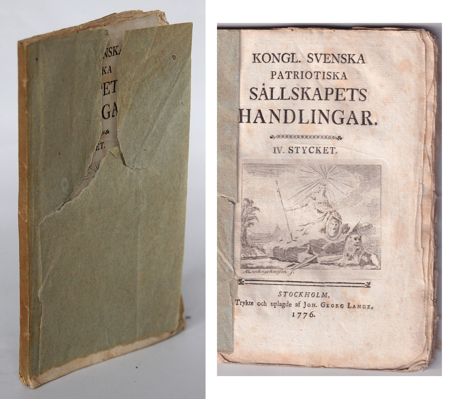 Sthlm, J. G. Lange, 1776. 8:o. (2),100 s. Med grav. titelvinjett. Häftad och oskuren i samtida gråpappersomslag vars framsida är trasig. Lagerfläckig. Från Näfveqvarn. Med stpl, numrering och gallringsstpl från Sigtunastiftelsen.