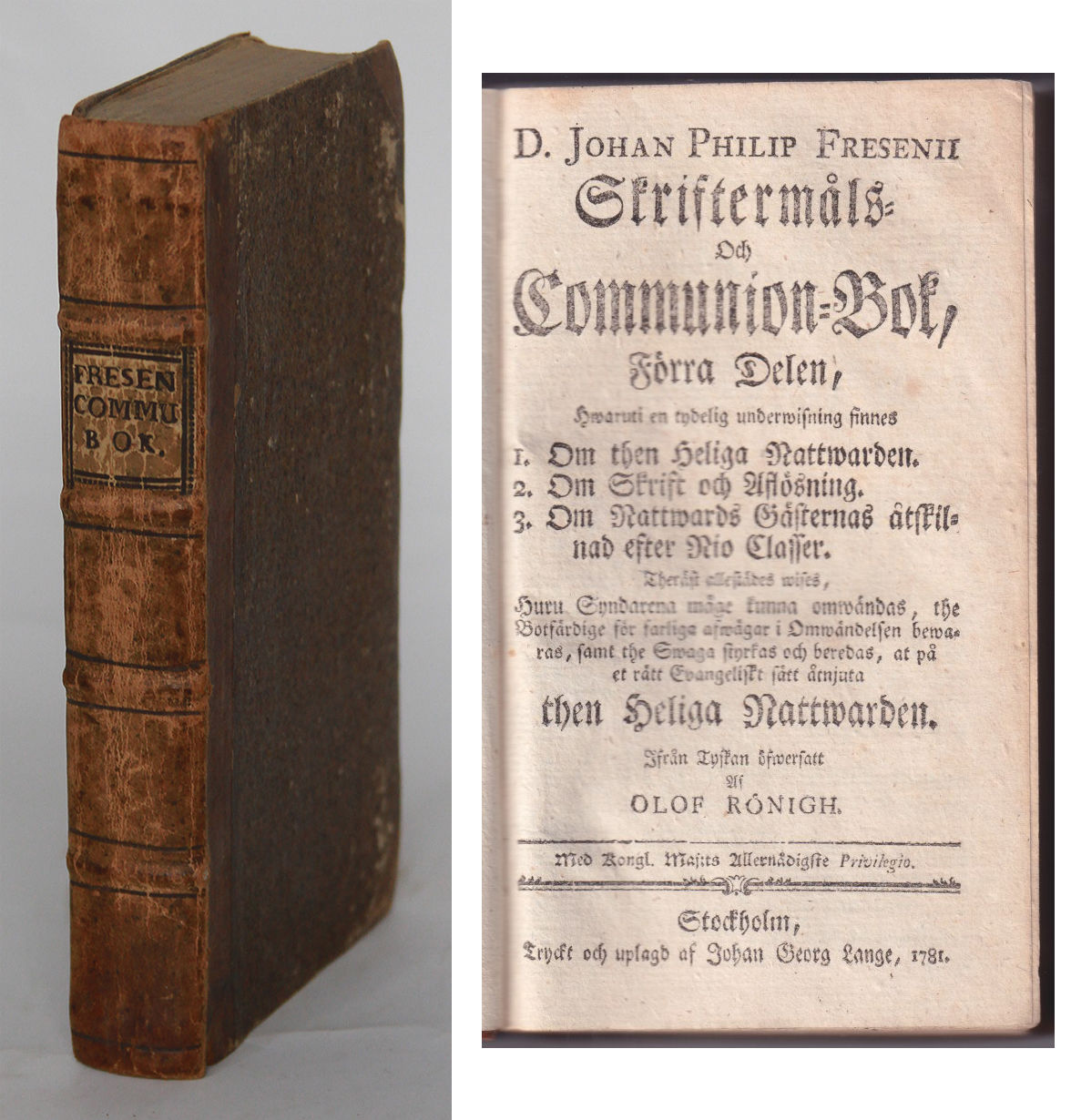 Med ett företal av översättaren Olof Rönigk vars namn är felstavat i titeln. Denna översättning utkom första gången 1753 och omtrycktes många gånger under en dryg hundraårsperiod. Även Fresenius övriga skrifter översattes flitigt till svenska. Johann Philip Fresenius (1705-61) var bl.a. pastor i Frankfurt am Main. Han var pietistiskt färgad och polemiserade starkt mot Zinzendorf och herrnhutismen. Han var familjen Goethes själasörjare och omnämns i ”Dichtung und Wahrheit”. Han är också förebild till överhovpredikanten i ”Bekentnisse einer schönen Seele” i ”Wilhelm Meisters Lehrjahre”.