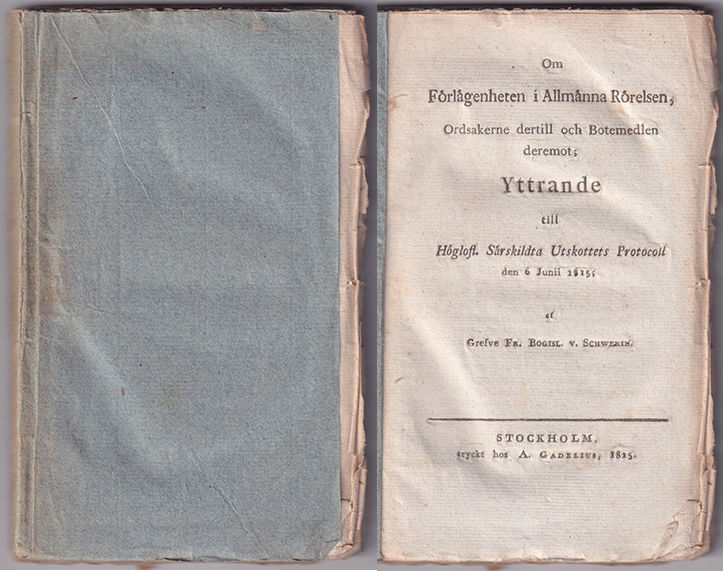 Bring Riksdagshandlingar s. 201. Greven, riksdagsmannen och prosten i Sala Fredrik Bogislaus von Schwerin (1764-1834) understödde, utgav och författade ett flertal publikationer, oftast med folkbildningsambitioner. Tillsammans med J. C. Askelöf och Clas Livijn gav han 1816-17 ut tidskriften ”Läsning till utbredande af medborgerliga kunskaper” och senare under 1817 gav han ut arbetet ”Bidrag till kännedom af fäderneslandet”. Under riksdagen 1815 var Schwerin ordförande i det särskilda utskott som tillsatts för att avhjälpa den ekonomiska kris, kallad ”Förlägenheten i allmänna rörelsen”, som följde på krigen i Europa under början av 1800-talet. I debatten om hur denna bäst skulle avhjälpas var Schwerin en av de viktigaste aktörerna. Meningsmotståndare till den konservativa Schwerin var den frihandelssinnade falangen med G. F. Wirsén, A. G. Mörner och H. Järta i spetsen.