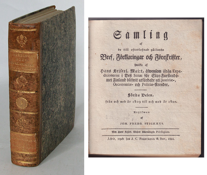Åbo, J. C. Frenckell & son, 1821. 4:o. (32),441,(1) s. Samtida fint hfrbd med marmorerat pärmpapper, guldornerad rygg, två bruna titeletiketter och rund olivgrön nummerskylt. Blekgula snitt. Inlagan delvis tryckt på tjockt papper. Fuktrand mot slutet vars text också har en del spegeltryck. Från Näfveqvarn. Med stpl, numrering och gallringsstpl från Sigtunastiftelsen. Endast del I.