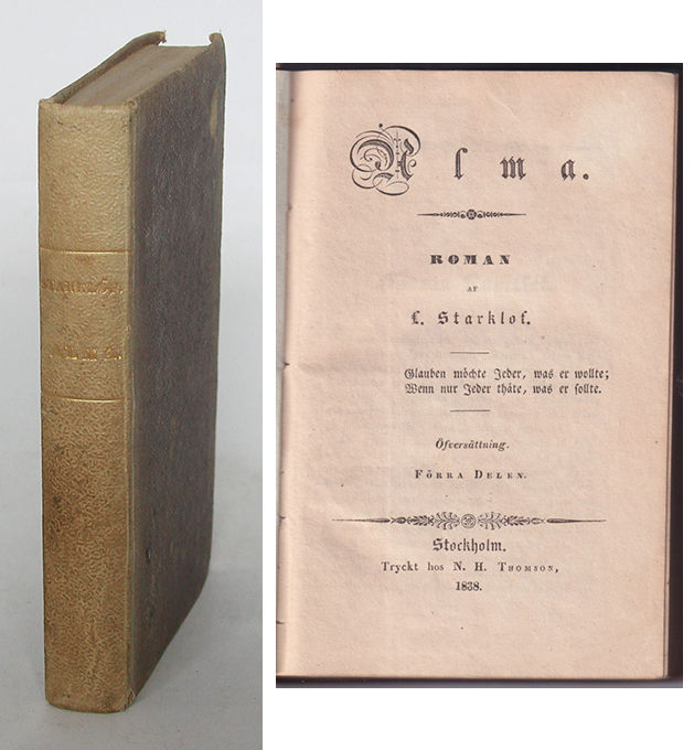 Furuland Bibliografi över svenska skönlitterära häftesserier K:45. Utgiven i ”Kabinets bibliothek af den nyaste litteraturen”. Översättningen från tyska gjordes av förläggaren Niclas Hans Thomson själv. Det lilla träsnittet föreställer en bläckplump i en kyrkobok som huvudpersonen Alma fått låna. Bläckplumpen täcker Almas föräldrars namn: ”De båda sista rubrikerna voro öfvergjutna med bläck och alldeles oläsliga. Hade händelsen eller någon tjenstaktig hand kastat denna svarta slöja öfver den sorgliga hemligheten?” Ludwig Starklof (1789-1850) var teaterman och skriftställare. Det tyska originalet ”Alma” utkom i Hamburg 1834. Fredrika Lovisa ”Louise” Sederholm (1816-58) var född Sparre och gift med Johan Sederholm på Näfveqvarns bruk.