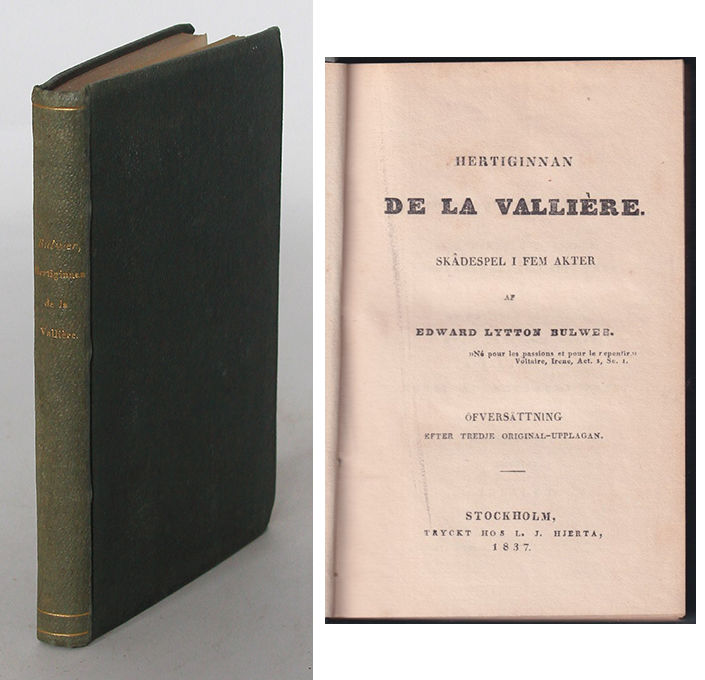 Furuland Bibliografi över svenska skönlitterära häftesserier L:63. Klemming Sveriges dramatiska litteratur s. 267. Utgiven i Hjertas ”Nytt läse-bibliothek”. Översatt av Johan Albert Wulff. Originalet ”The Duchess de la Vallière” utkom samma år. Johan Sederholm (1813-83) övertog efter studier i Uppsala skötseln av Näfveqvarns bruk där han var brukspatron till sin död.