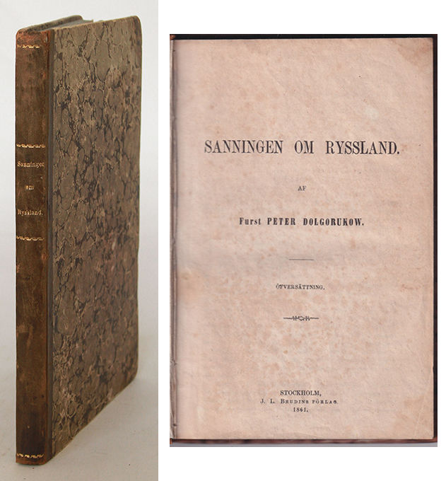 Översatt av J. A. Kiellman-Göranson från det franska originalet ”La vérité sur la Russie” som utkom första gången 1860. Prins Peter Dolgorukov (1816-68) skrev en rad kritiska skrifter riktade mot tsardömet i Ryssland vilka gjorde att han fick tillbringa delar av sitt liv i landsflykt. Till svenska översattes även hans ”Notiser om de förnämsta adliga familjer i Ryssland” 1843.
