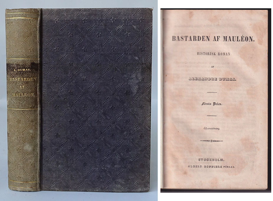 Furuland Bibliografi över svenska skönlitterära häftesserier E:14. Utkom häftesvis i Bonniers serie ”Europeiska följetongen”. Originalet ”Le bâtard de Mauléon” utkom 1846. Johan Sederholm (1813-83) övertog efter studier i Uppsala skötseln av Näfveqvarns bruk där han var brukspatron till sin död.