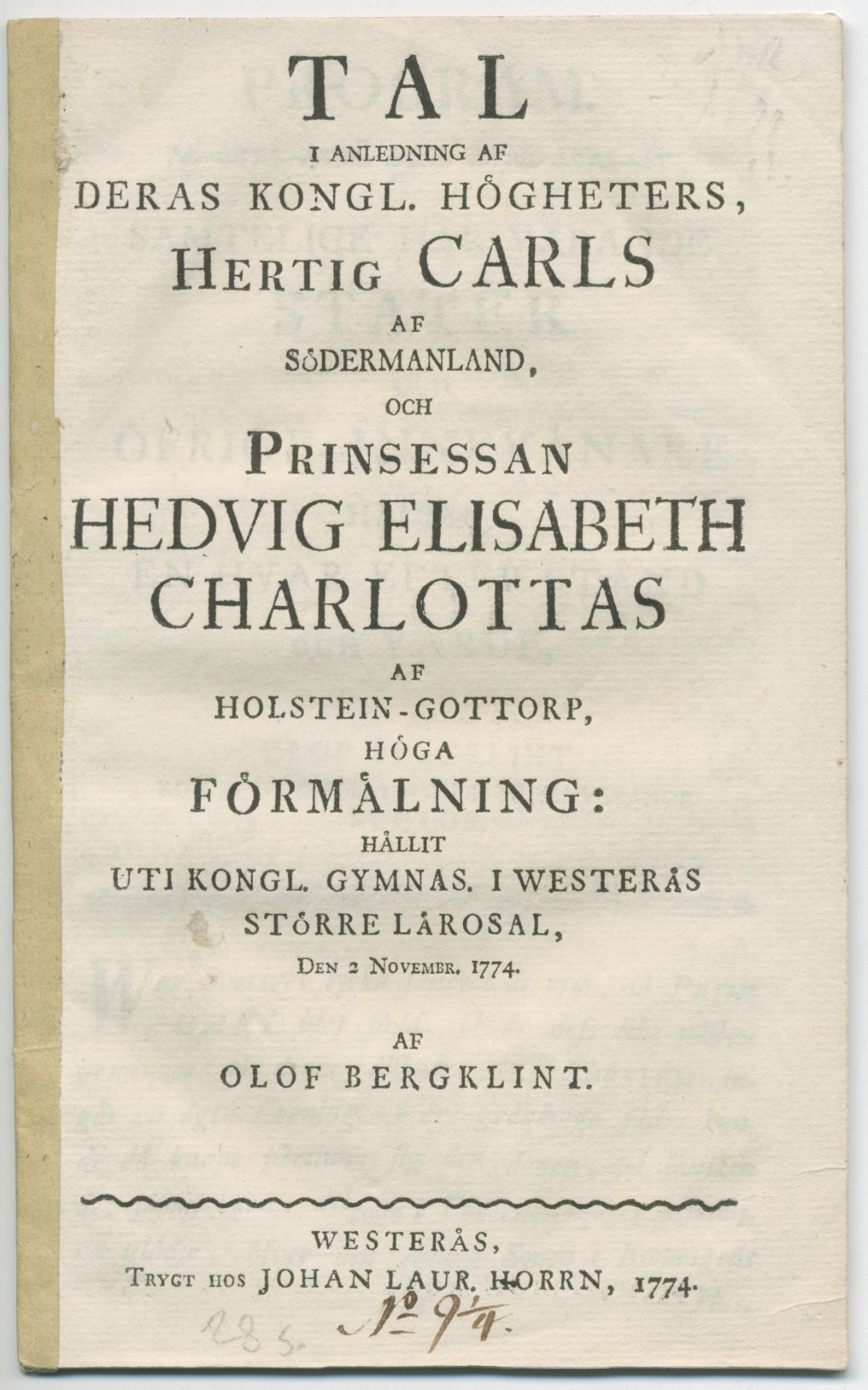 Tal i anledning af deras kongl. högheters, hertig Carls af Södermanland, och prinsessan Hedvig Elisabeth Charlottas af Holstein-Gottorp, höga förmälning: hållit uti kongl. gymnas. i Westerås större lärosal, den 2 novembr. 1774.