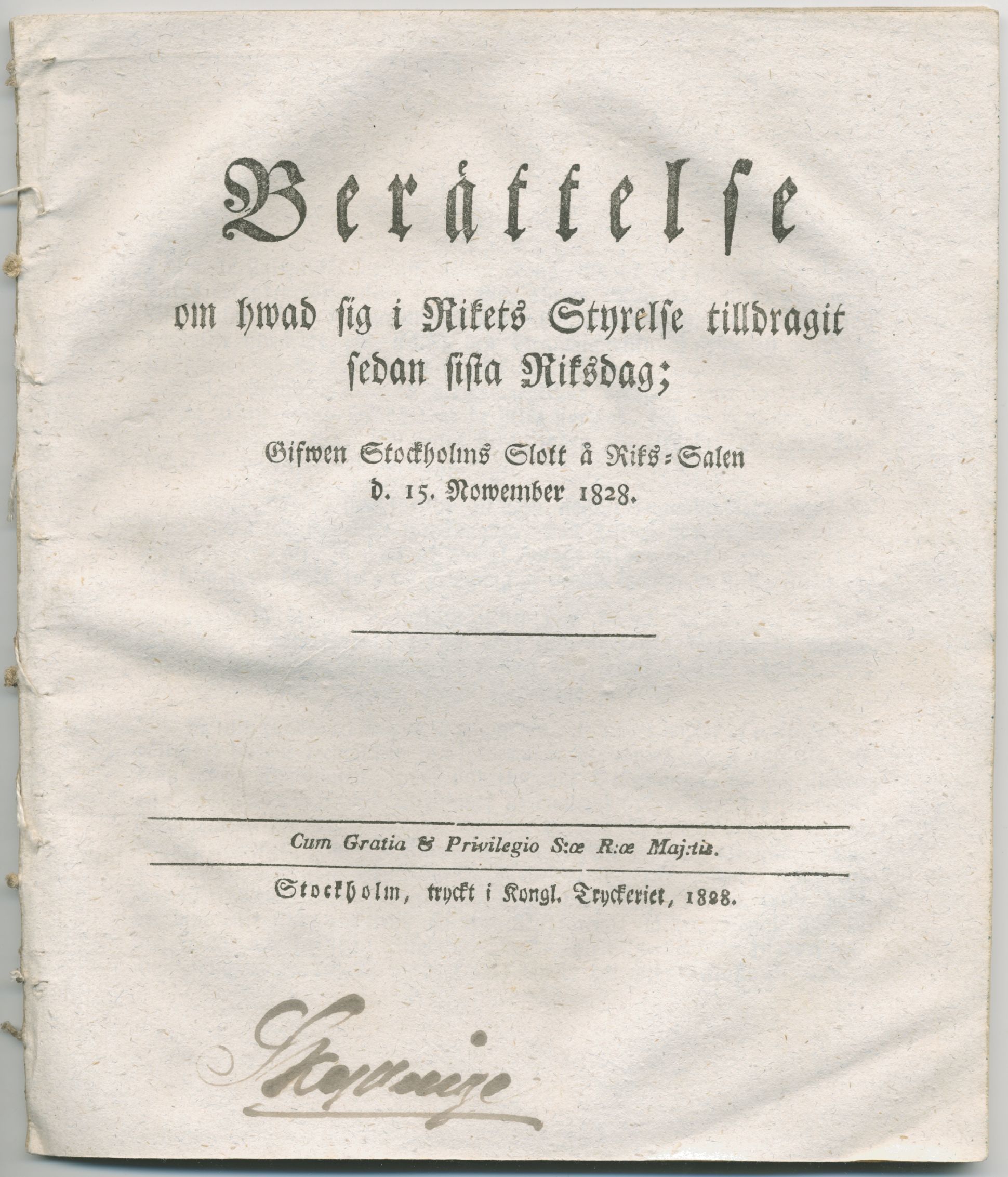 Berättelse om hwad sig i rikets styrelse tilldragit sedan sista riksdag; gifwen Stockholms slott å Riks-salen d. 15 nowember 1828.