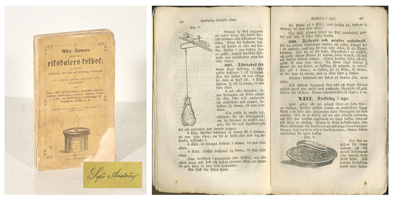 Blomqvist Mat och dryck i Sverige s. 215. De sista opaginerade sidorna utgörs av en bokannons med ett par avtryckta recensioner. Innehåller 459 olika recept. Alexis Soyer (1809-58) föddes i Frankrike och flyttade sedermera till England och blev under första delen av 1800-talet en av landets mer prominenta kockar med bland annat uppdrag för det engelska hovet. Han använde också sin berömdhet för att hjälpa till under hungersnöden på Irland vid mitten av 1800-talet. I samband med Krimkriget reste han på egen bekostnad till bland annat Konstantinopel. Tillsammans med Florence Nightingale och den medicinska personalen omorganiserade han provianteringen för sjukhusen där och i Scutari. Han skrev många kokböcker, till exempel ”A Shilling Cookery Book for the People” 1855, som här föreligger i svensk översättning.
