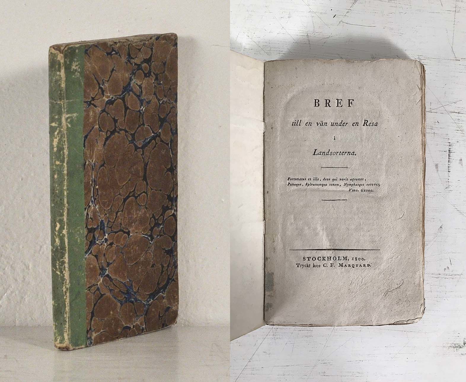Sthlm, C. F. Marquard, 1800. 8:o. 151,(1) s. Häftad i något nött nära samtida pappomslag med grön glättad rygg och marmorerade pärmsidor. Pärmarnas insidor med spår av kuvertmakulatur poststämplad i Hedemora 1837. Lite nagg överst på pärmarna. Bra oskuren inlaga med endast sporadiska småfläckar.