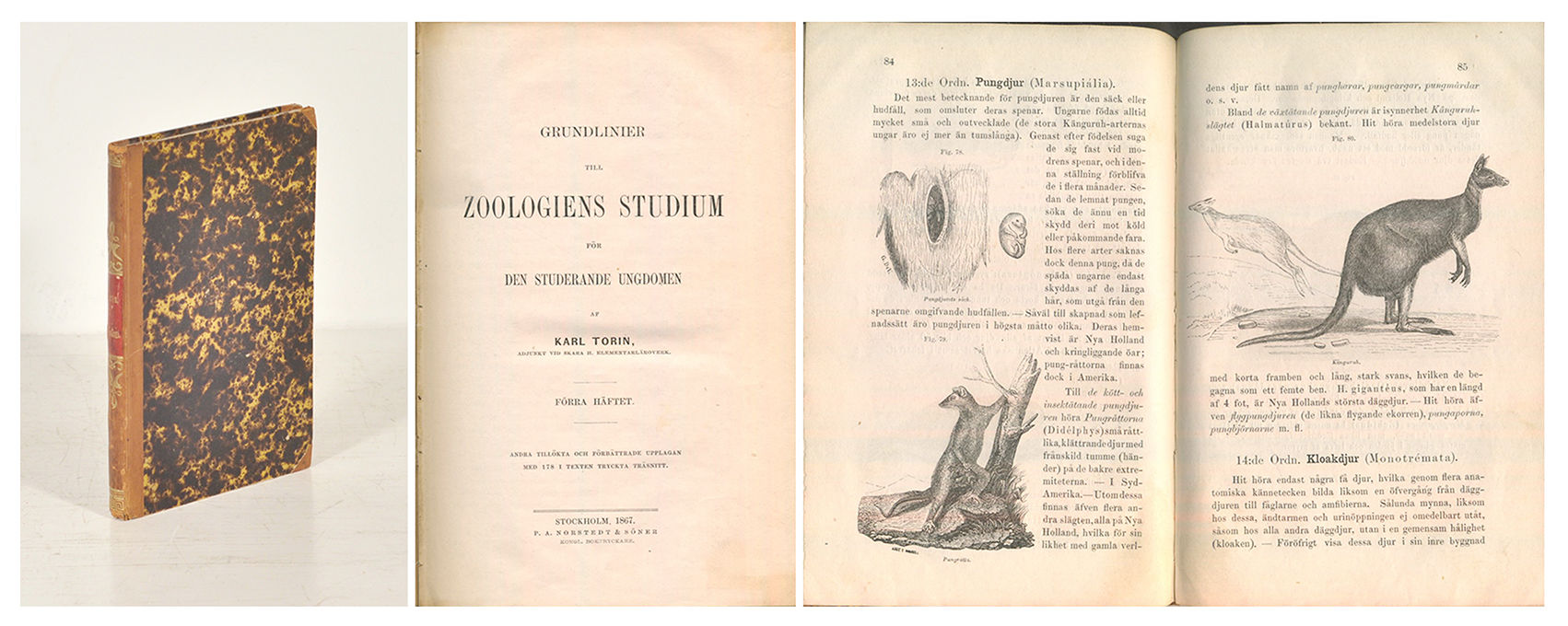 Första upplagan trycktes 1862-64. En åttonde och sista upplaga utkom 1894. Detta första häfte beskriver ryggradsdjuren alltså däggdjur och fåglar. Det saknade andra häftet utkom 1868 och avhandlade de ryggradslösa djuren. Karl Torin (1826-1908) var verksam vid skolan och biblioteket i Skara samt även aktiv i Västergötlands fornminnesförening. Han hade ett omfattande privatbibliotek med stora naturvetenskapliga inslag, vilket såldes på auktion i Uppsala 1908.