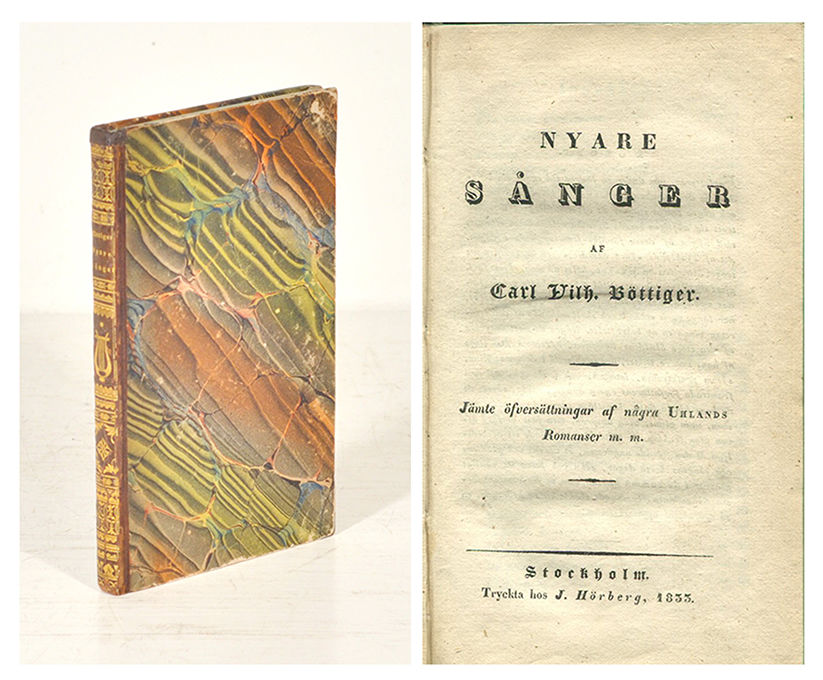 Sthlm, J. Hörberg, 1833. Stor 12:o. 132 s. Samtida hfrbd med rikt guldornerad rygg, bl.a. inkluderande en lyra. Gröna snitt. Ryggen torr och med lite ytligt krackelerad gulddekor samt en lagning överst. Enstaka småfläckar.