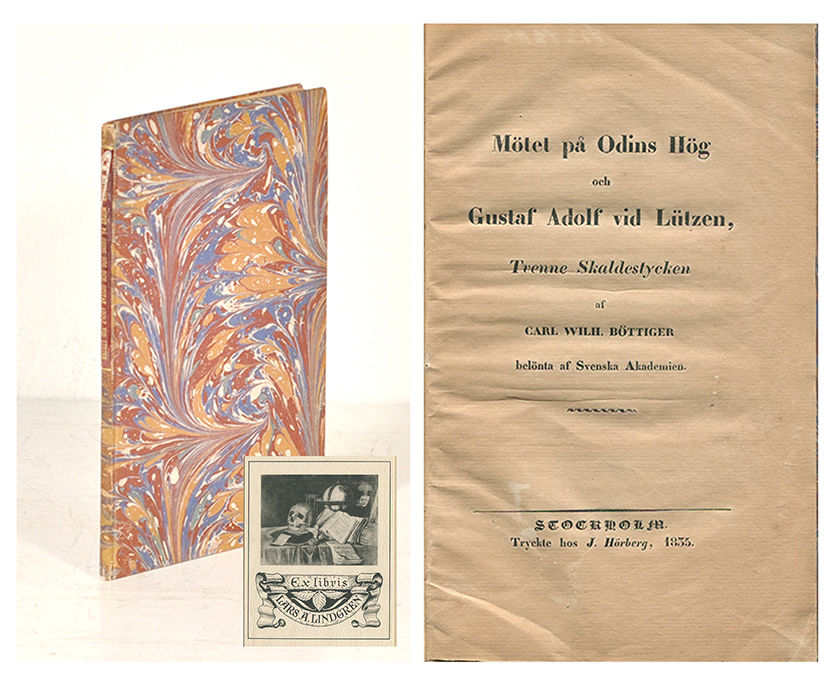 Sthlm, J. Hörberg, 1835. 8:o. 56 s. Marmorerat pappbd med rödbrun titeletikett i skinn (Hedberg). Titeletiketten med skada överst. Inlagan lätt bruntonad. Lars A. Lindgrens exlibris.