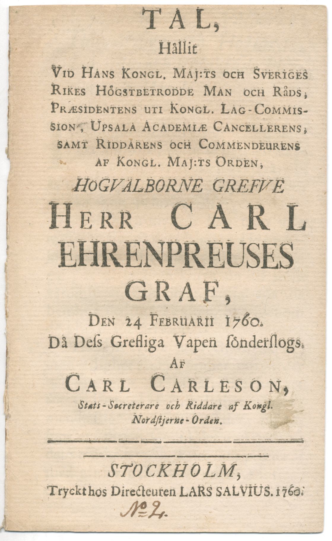 Tal, hållit vid hans kongl. maj:ts och Sveriges rikes högstbetrodde man och råds, præsidenten uti kongl. lag-commission, Upsala academiae cancellerens, samt riddarens och commendeurens af kongl. maj:ts orden, högvälborne grefve herr Carl Ehrenpreuses graf, den 24 februarii 1760 då dess grefliga vapen sönderslogs.