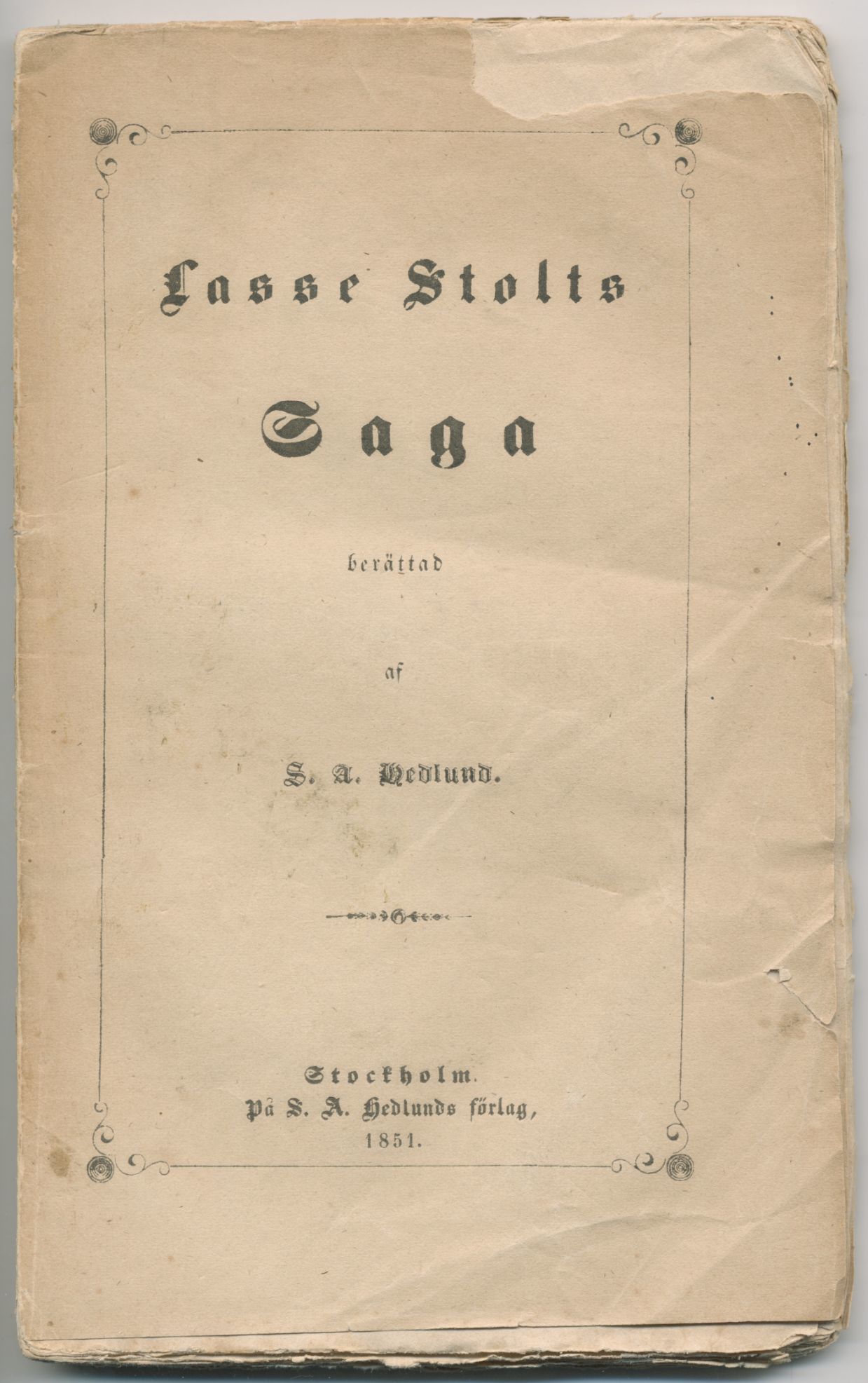 Sthlm, Hörbergska boktryckeriet, 1851. 12:o. 107 s. Häftad, oskuren och delvis ouppskuren i något fläckigt, tryckt omslag. Pappersförlust i övre delen av främre omslag, som även har en reva och ryggen med revor överst. Inlagan lätt lagerfläckig.
