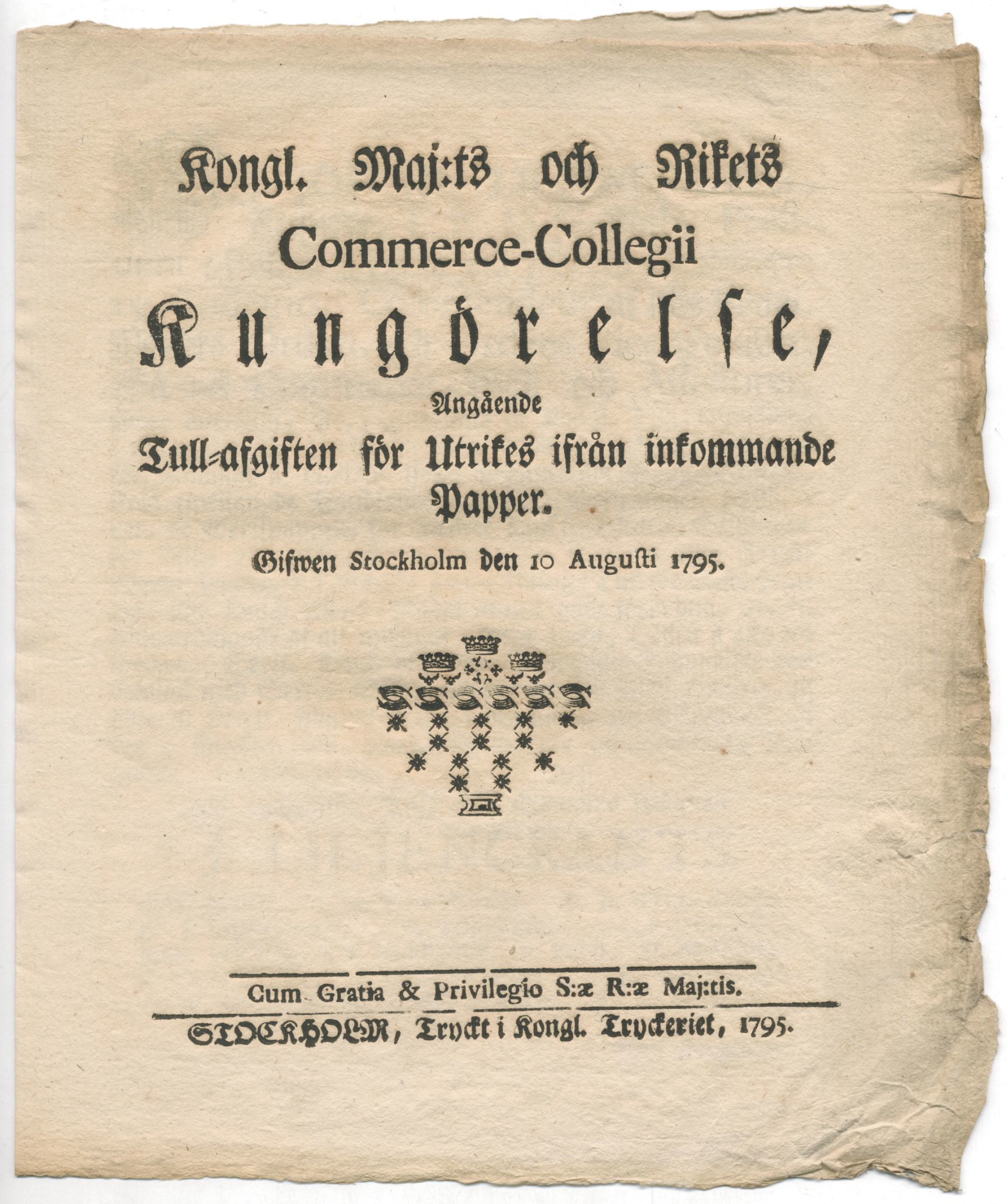 Kongl. maj:ts och rikets Commerce-collegii kungörelse, angående tull-afgiften för utrikes ifrån inkommande papper. Gifwen Stockholm den 10 augusti 1795.