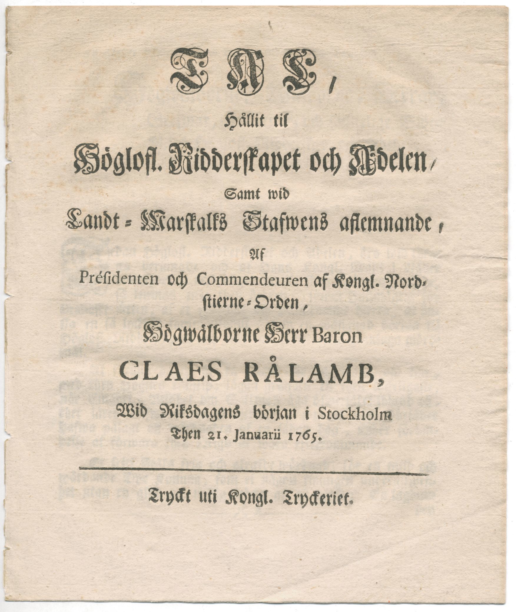 Tal, hållit til höglofl. ridderskapet och adelen, samt wid landt-marskalks stafwens aflemnande, af présidenten och commendeuren af kongl. Nordstierne-orden, högwälborne herr baron Claes Rålamb, wid riksdagens början i Stockholm then 21 januarii 1765.