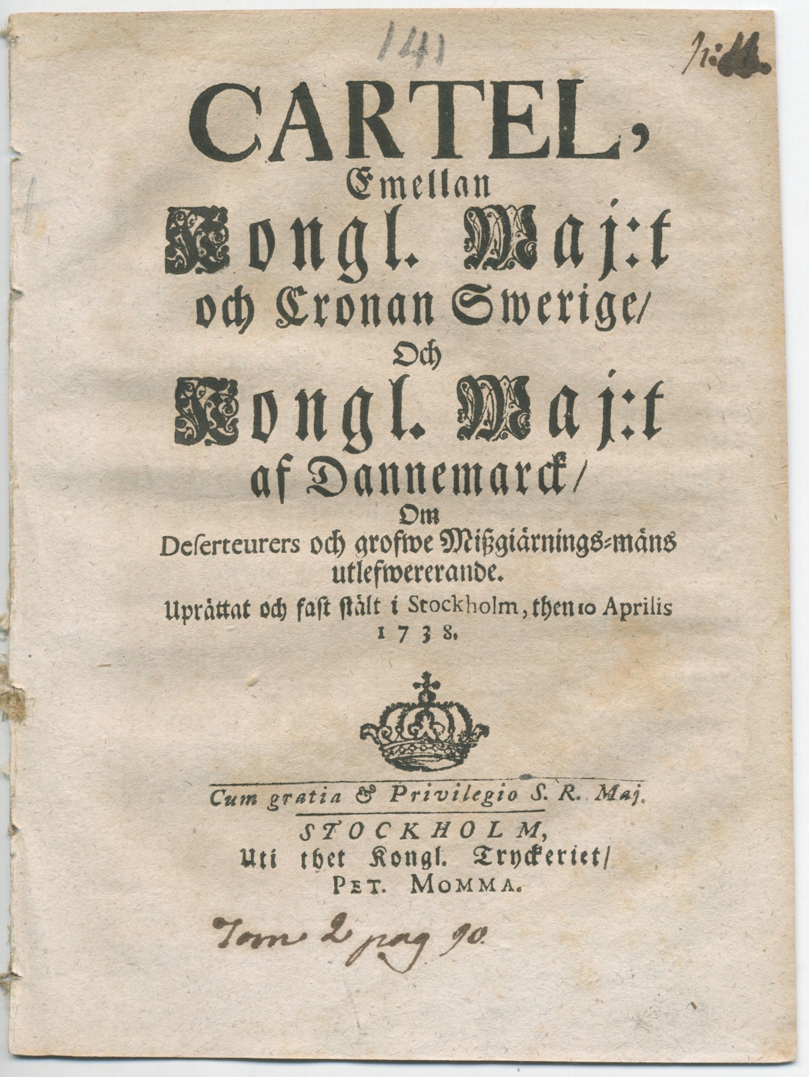 Cartel, emellan kongl. maj:t och cronan Swerige/ och kongl. maj:t af Dannemarck/ om deserteurers och grofwe missgiärnings-mäns utlefwererande. Uprättat och fast stält i Stockholm, then 10 aprilis 1738.