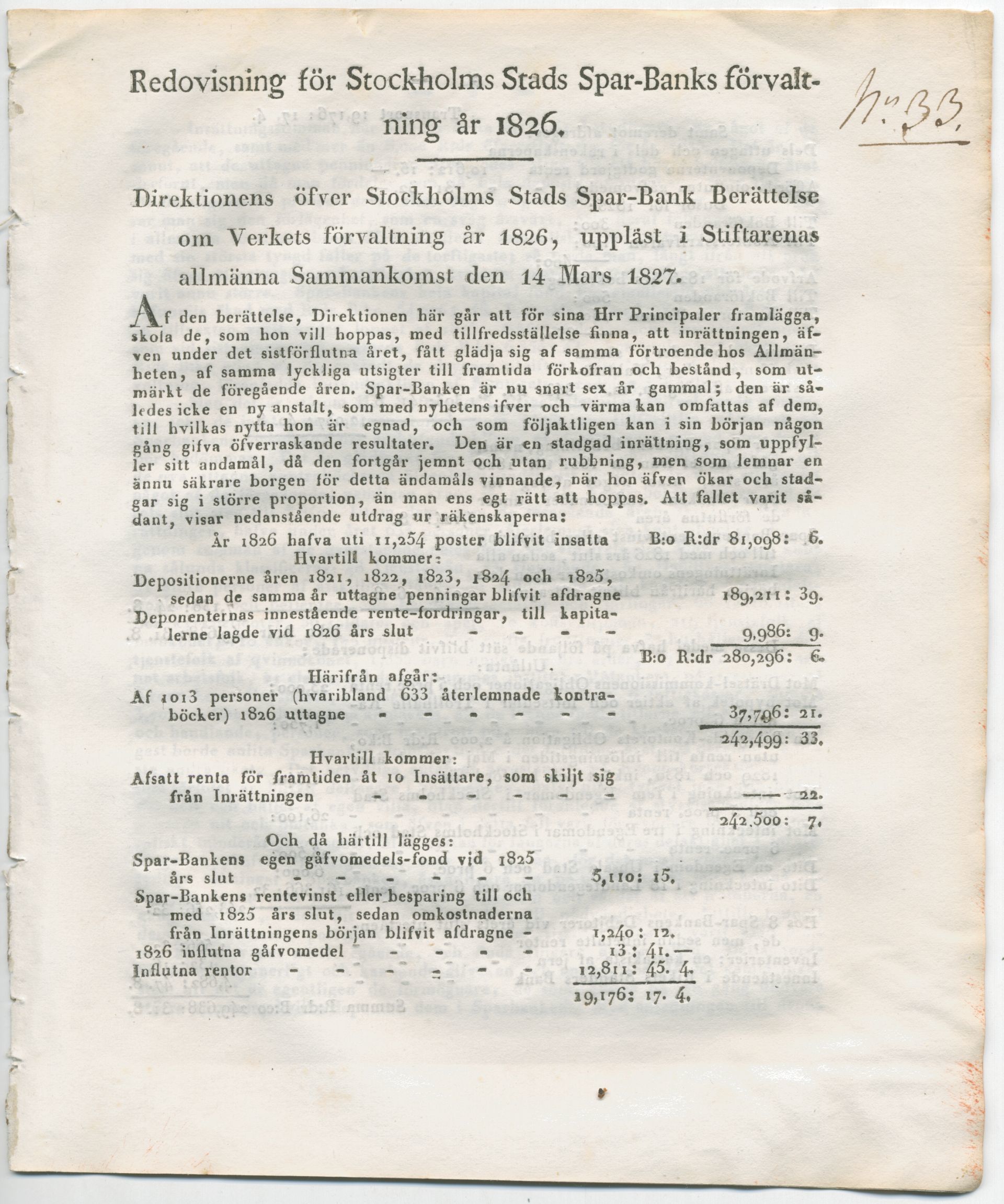 Uppläst den 14 mars 1827 och undertecknad av A. Lindeberg. Stockholms stads sparbank grundades 1821 med Carl af Forsell som initiativtagare och var landets andra sparbank.