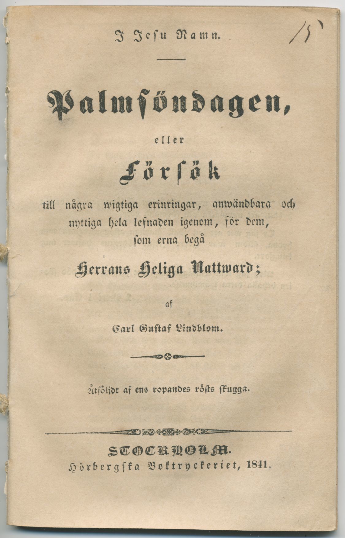 I Jesu namn. Palmsöndagen, efter försök till några wigtiga erinringar, anwändbara och nyttiga hela lefnaden igenom, för dem, som erna begå herrans heliga nattward. Åtföljdt af ens ropande rösts skugga.