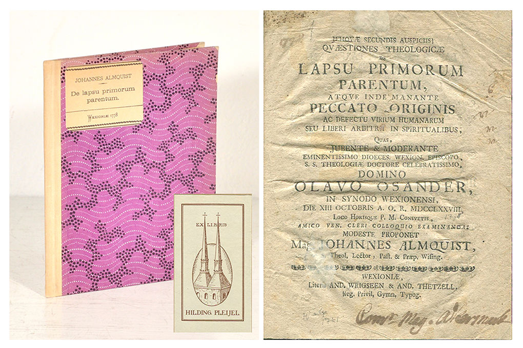 Växjö, A. Wrigseen & A. Thetzell, (1778). 4:o. (22) s. Beige hklbd från 1900-talets mitt med violett pärmpapper av äldre dekorerat papper med svart och vit dekor samt tryckt titeletikett av papper på frampärmen. Titelbladet solkigt och med fläckar och två lagningar. Gammal lagning i sista bladets övre marginal. Samtida tillskrift till komminister Åkermark på titelbladet. Med Hilding Pleijels exlibris med motiv från Växjö domkyrka och anteckning i blyerts på försättsbladet av Per-Erik Lindahl.