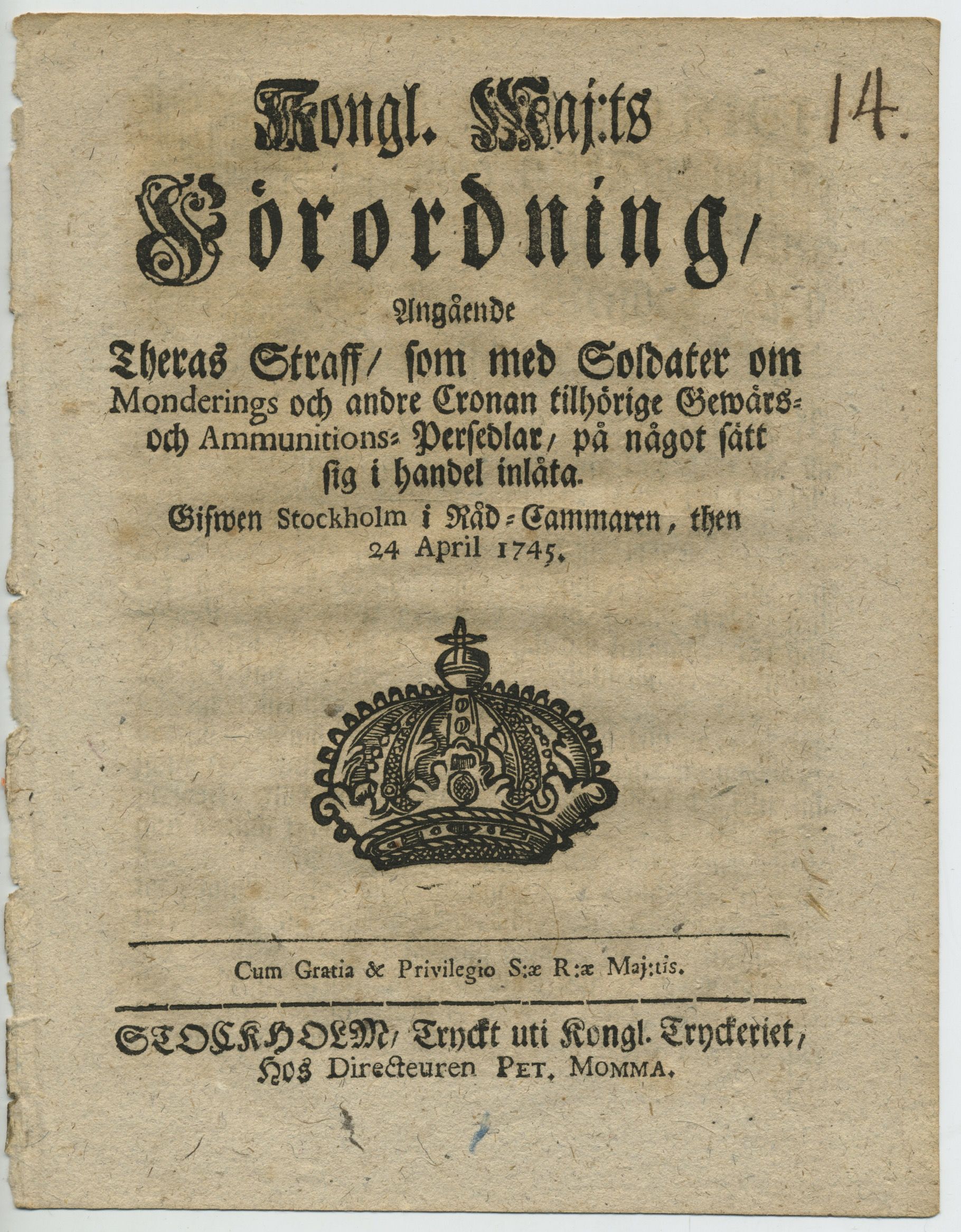 Kongl. maj:ts förordning/ angående theras straff/ som med soldater om monderings och andre cronan tilhörige gewärs- och ammunitions-persedlar, på något sätt sig i handel inlåta. Gifwen Stockholm i råd-cammaren, then 24 april 1745.