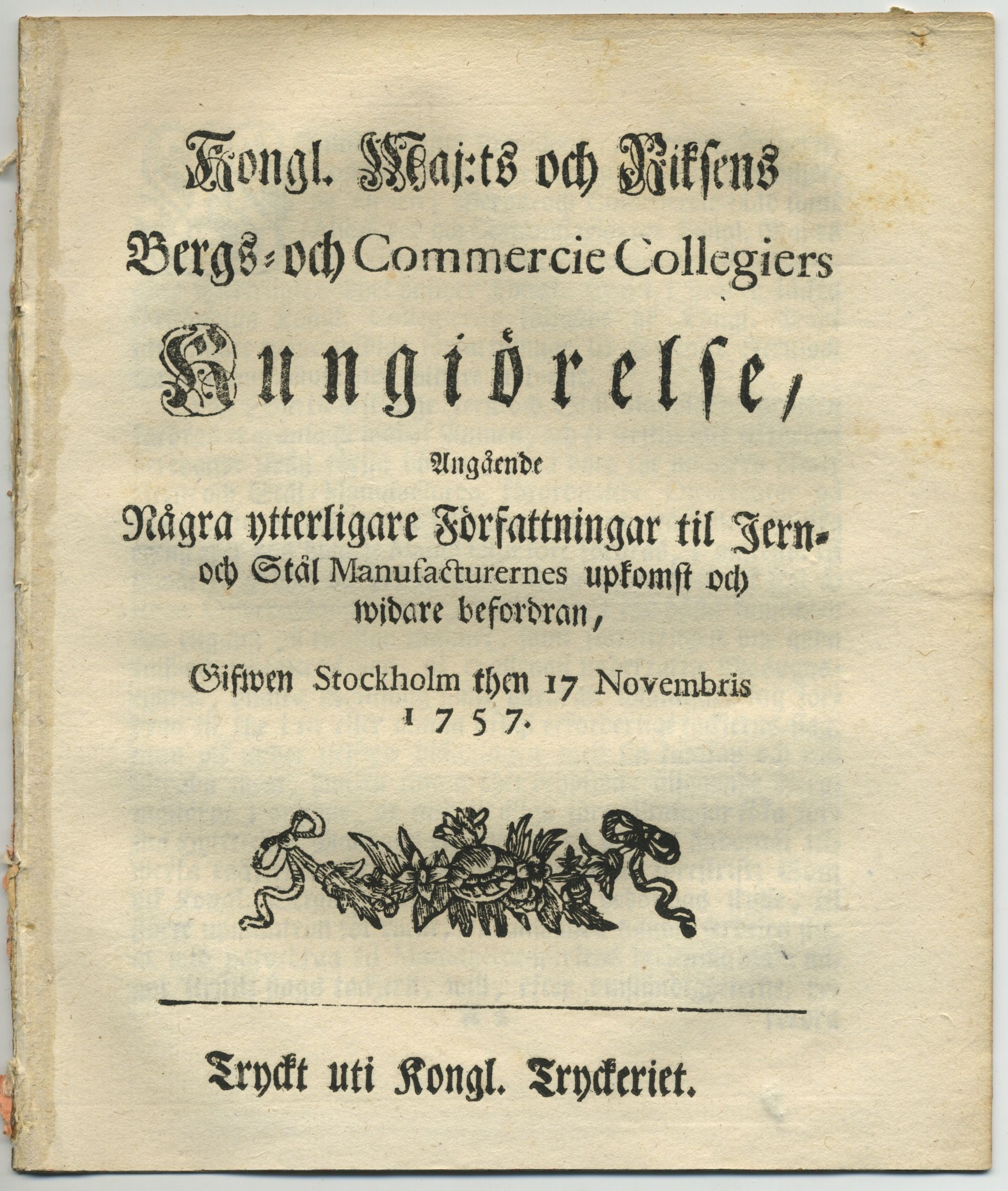 Kongl. maj:ts och riksens Bergs- och Commercie collegiers kungiörelse, angående några ytterligare författningar til jern- och stål manufacturernes upkomst och widare befordran, Gifwen Stockholm then 17 novembris 1757.