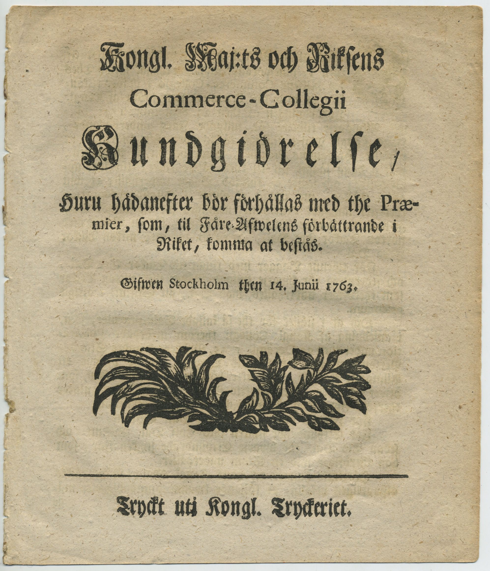 Kongl. maj:ts och riksens Commerce-collegii kundgiörelse, huru hädanefter bör förhållas med the præmier, som, til fåre-afwelens förbättrande i riket, komma at bestås. Gifwen Stockholm then 14 junii 1763.