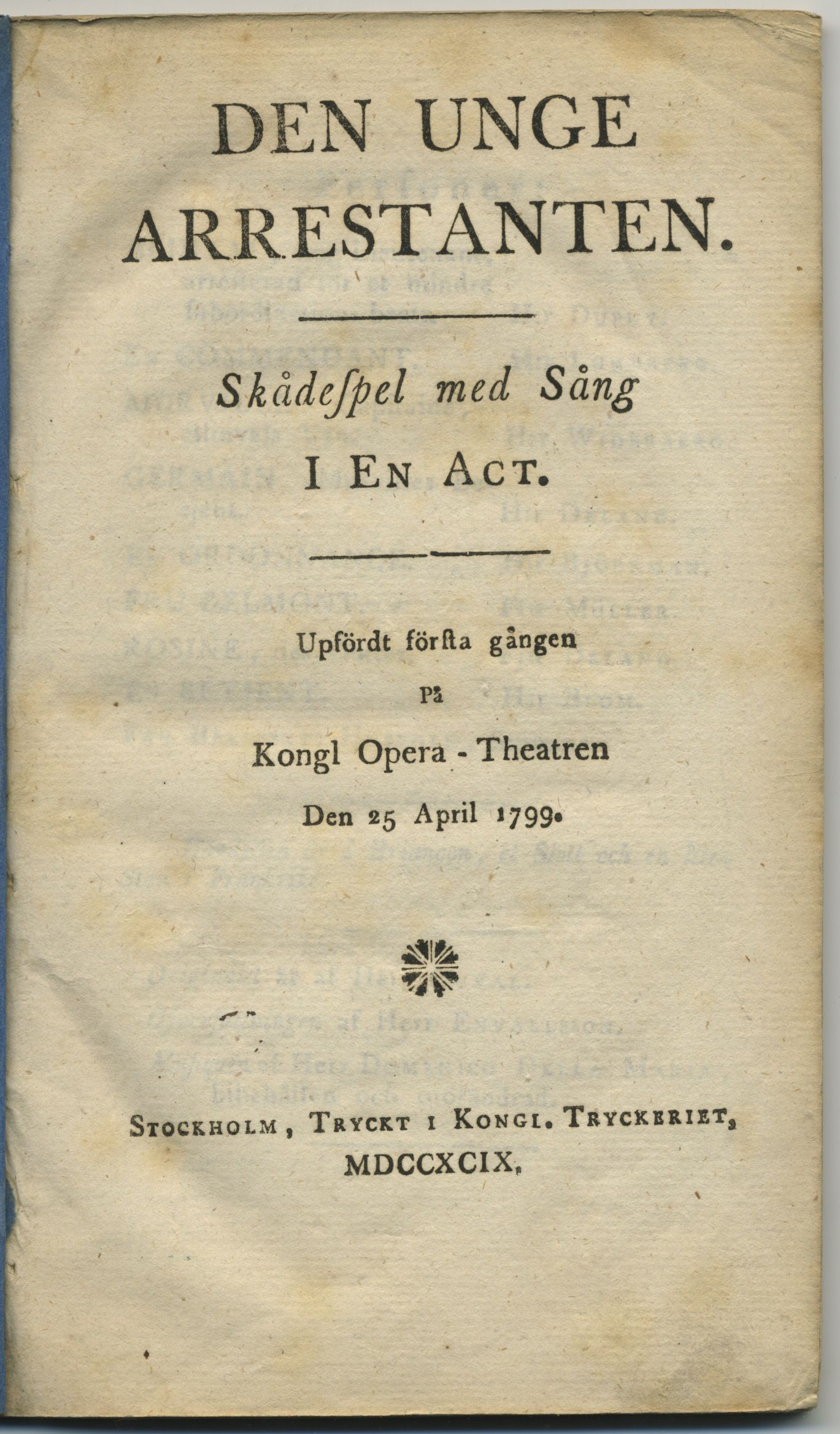 Den unge arrestanten. Skådespel med sång i en act. Upfördt första gången på Kongl. opera-theatren den 25 april 1799.