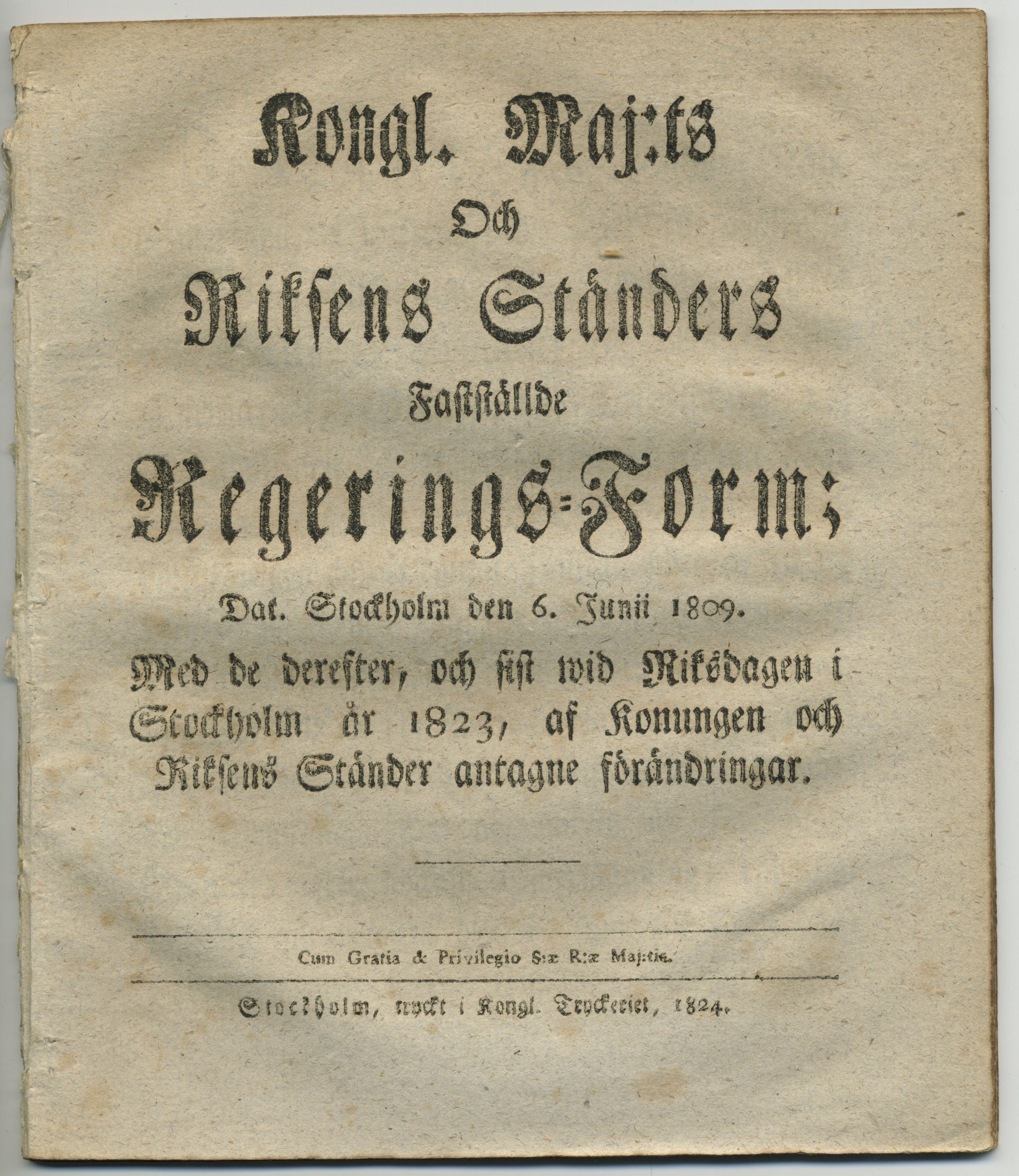 Kongl. maj:ts och riksens ständers fastställde regerings-form; dat. Stockholm den 6 junii 1809. Med de derefter, och sist wid riksdagen i Stockholm år 1823, af konungen och riksens ständer antagne förändringar.