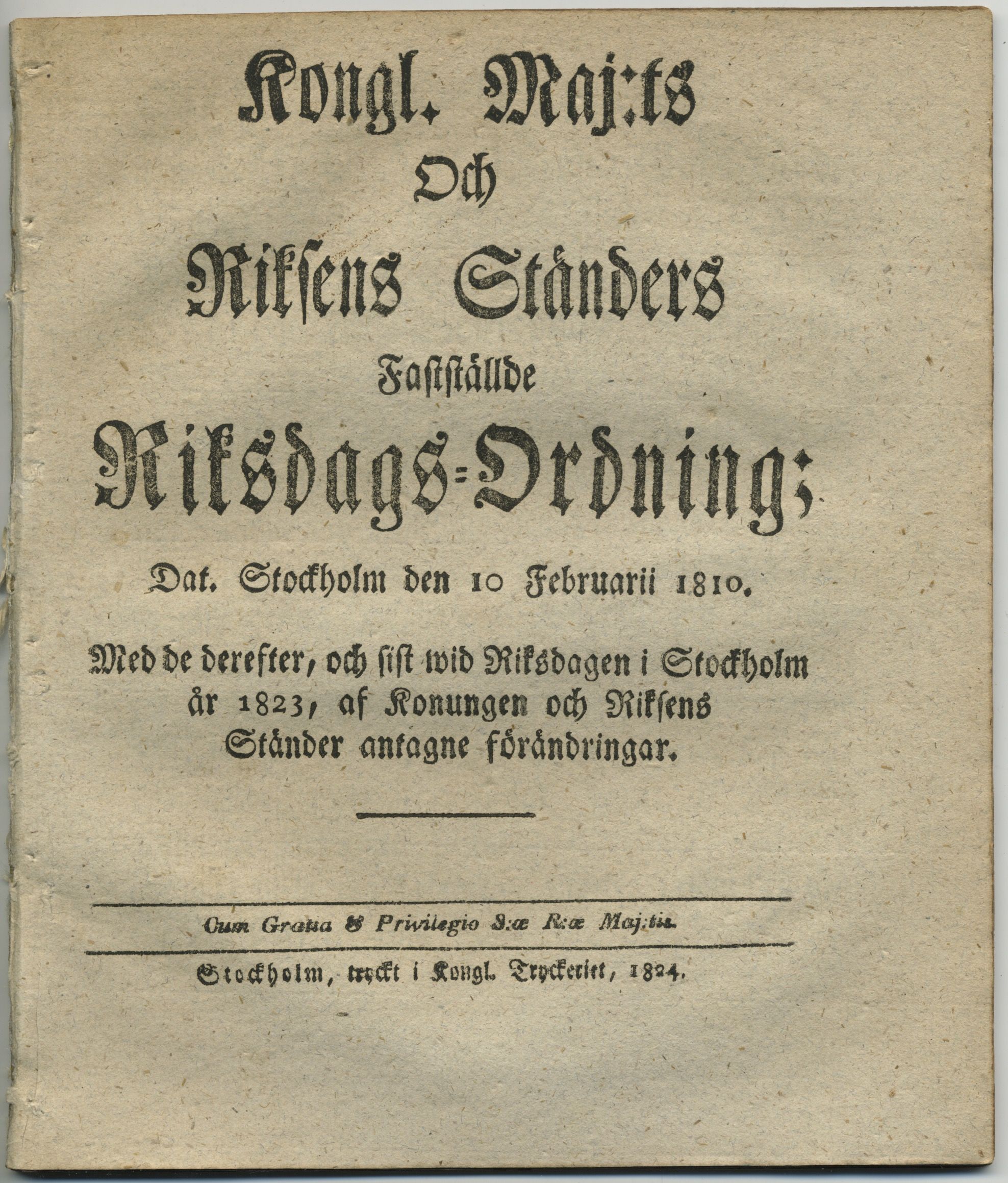 Kongl maj:ts och riksens ständers fastställde riksdags-ordning; dat. Stockholm den 10 februarii 1810. Med de derefter, och sist wid riksdagen i Stockholm år 1823, af konungen och riksens ständer antagne förändringar.
